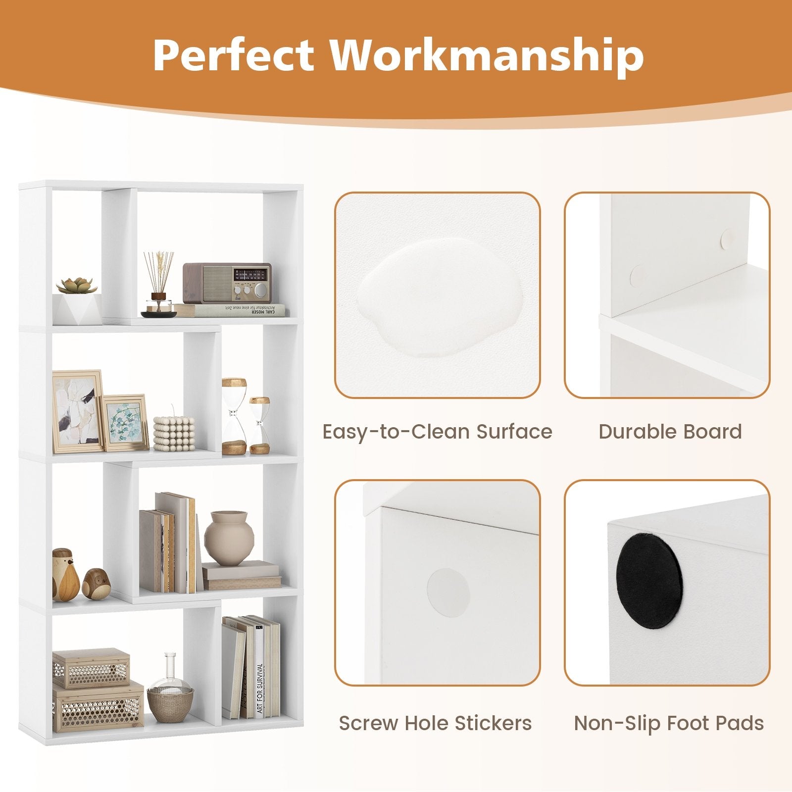 Stylish Geometric Design: The 4-tier bookshelf features a unique geometric pattern that adds a modern touch to any room. The visually appealing design also serves as a decorative piece enhancing the overall aesthetics of your home.