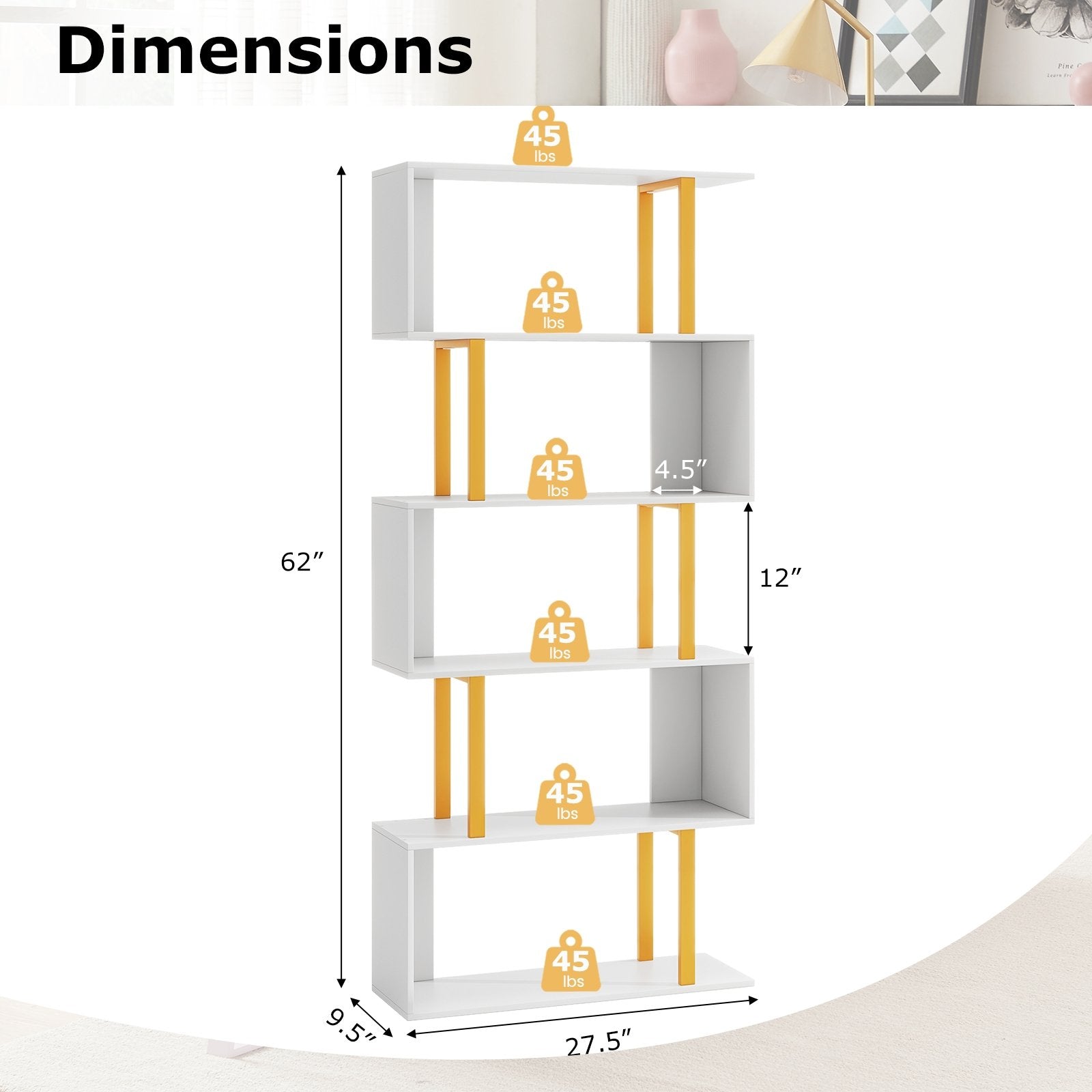 Elevate Your Interior: The geometric bookcase features S-shaped shelves coupled with a stunning gold frame that's sure to be the centerpiece of your room. Its chic design makes it a statement piece that transforms your space with modern aesthetics.