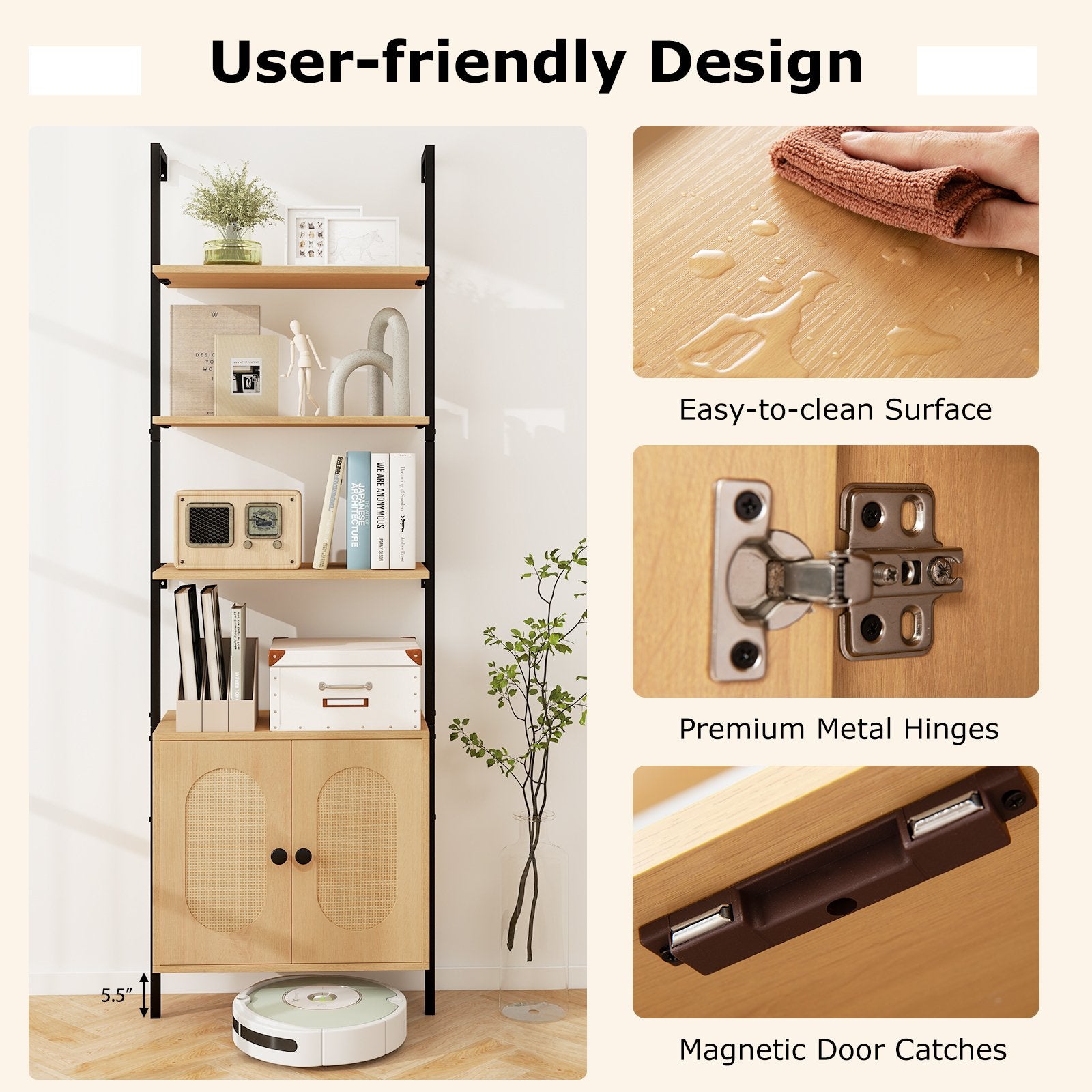 72.5 Inch 6-Tier Wall Mounted Ladder Bookshelf with Rattan Cabinet-Natural