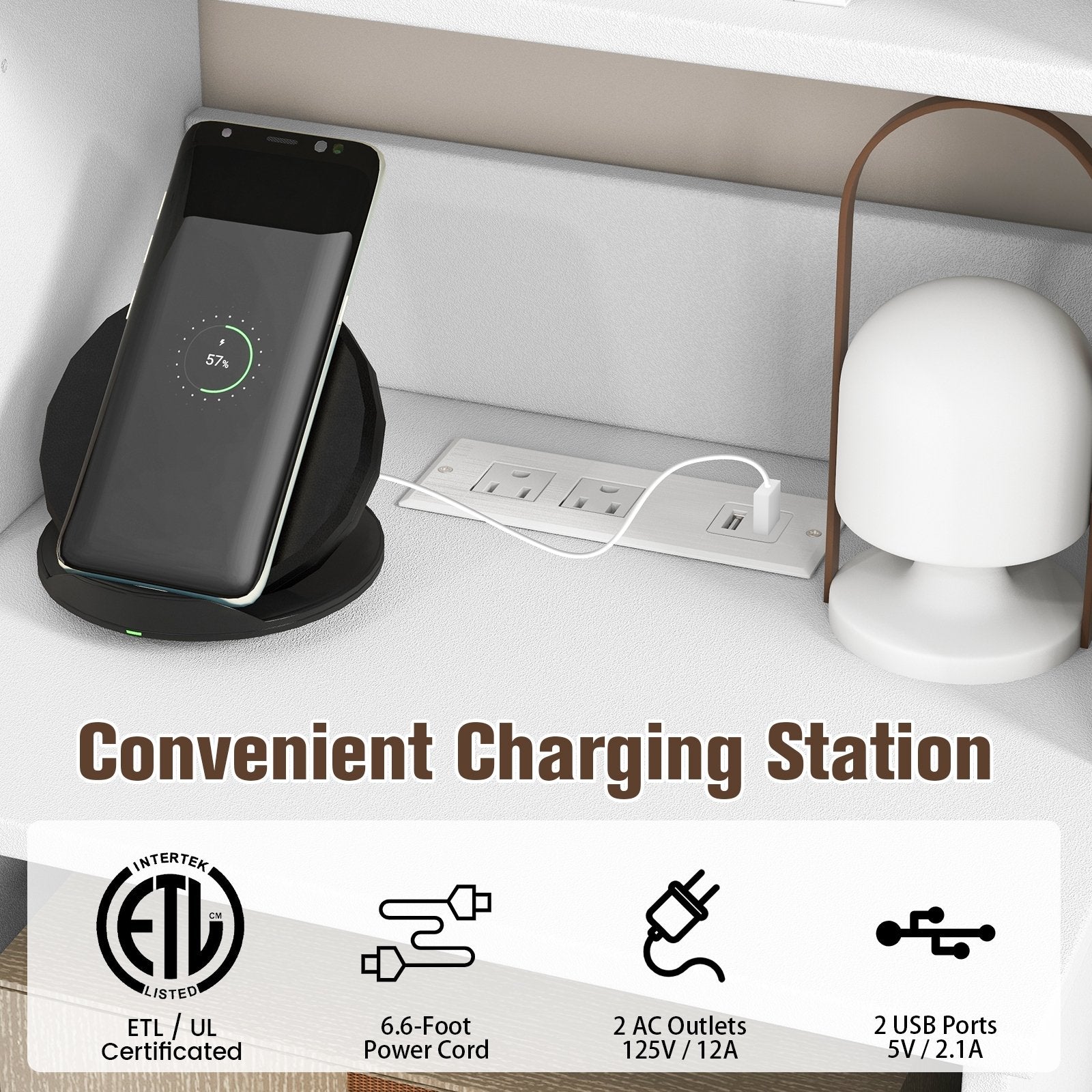 Convenient Bedside Charging Station: Not only is it a storage cabinet but also a mobile charging station. This bedside storage cabinet is equipped with a built-in drain plug so you can easily charge your phone tablet and other electronic devices. The drain plug includes 2 120V AC outlets and 2 USB charging ports to meet your different needs.