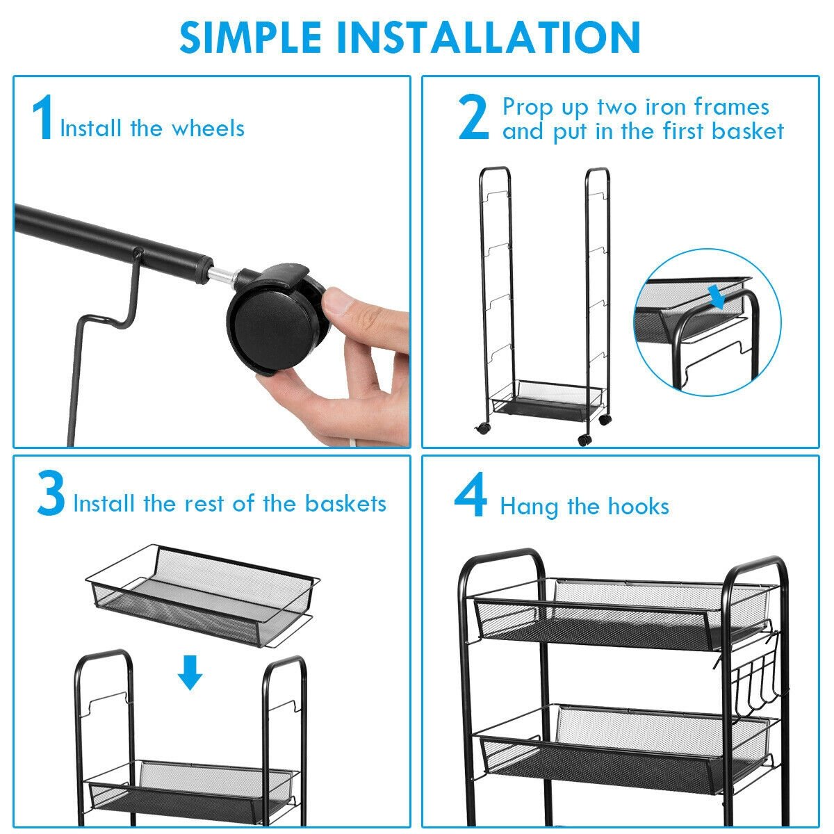 5 Baskets Offers Ample Storage Space: This mesh rolling cart makes it convenient to keep everything you use in a suitable place. With 5 large shelves you can place your office supplies kitchen supplies toiletries and other small/big items in your home or office. It also includes 5 hooks for added convenience and functionality. A clean living area is no longer a dream.