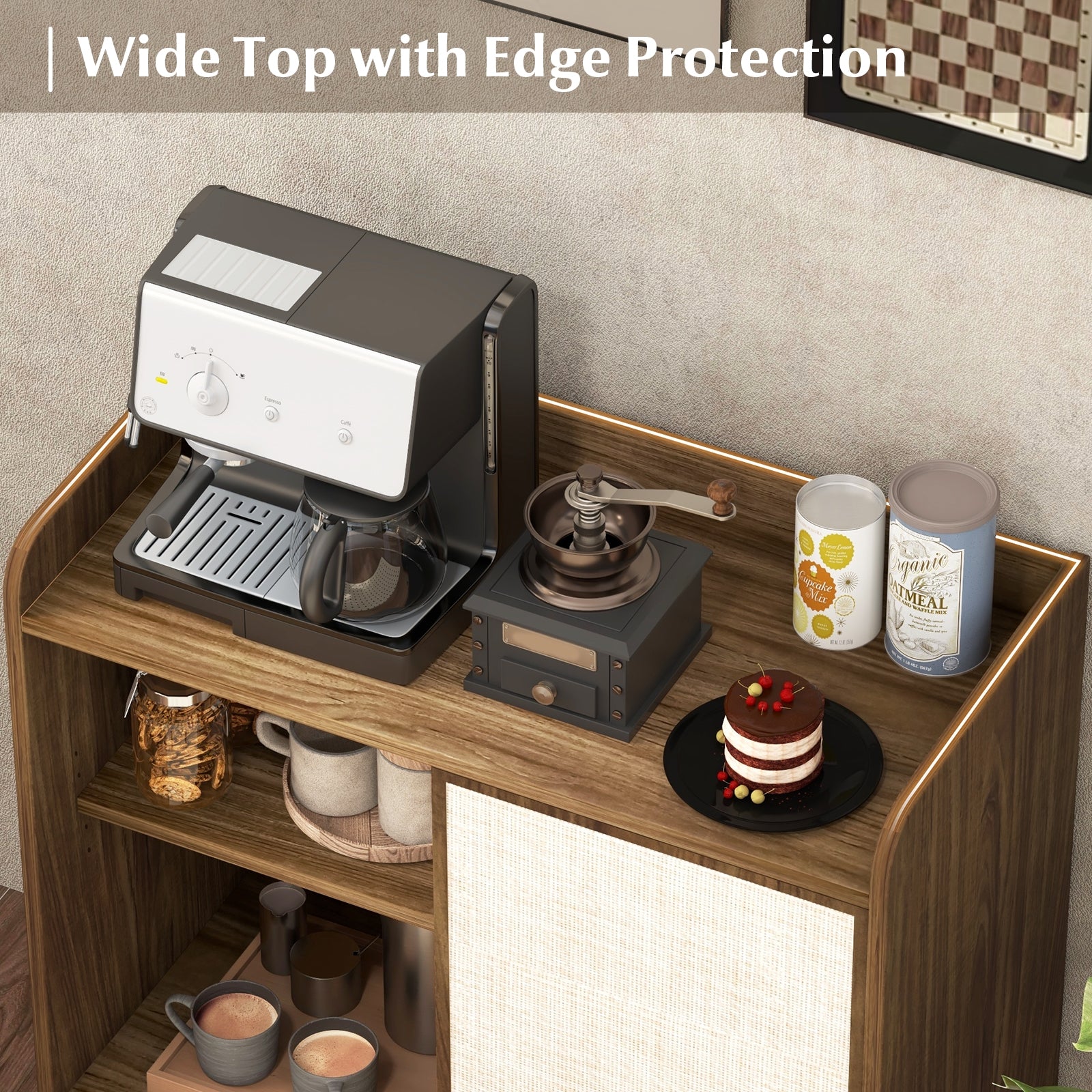 Rattan Buffet Sideboard Mid Century Floor Storage Cabinet with Sliding Door and Adjustable Shelves-Walnut