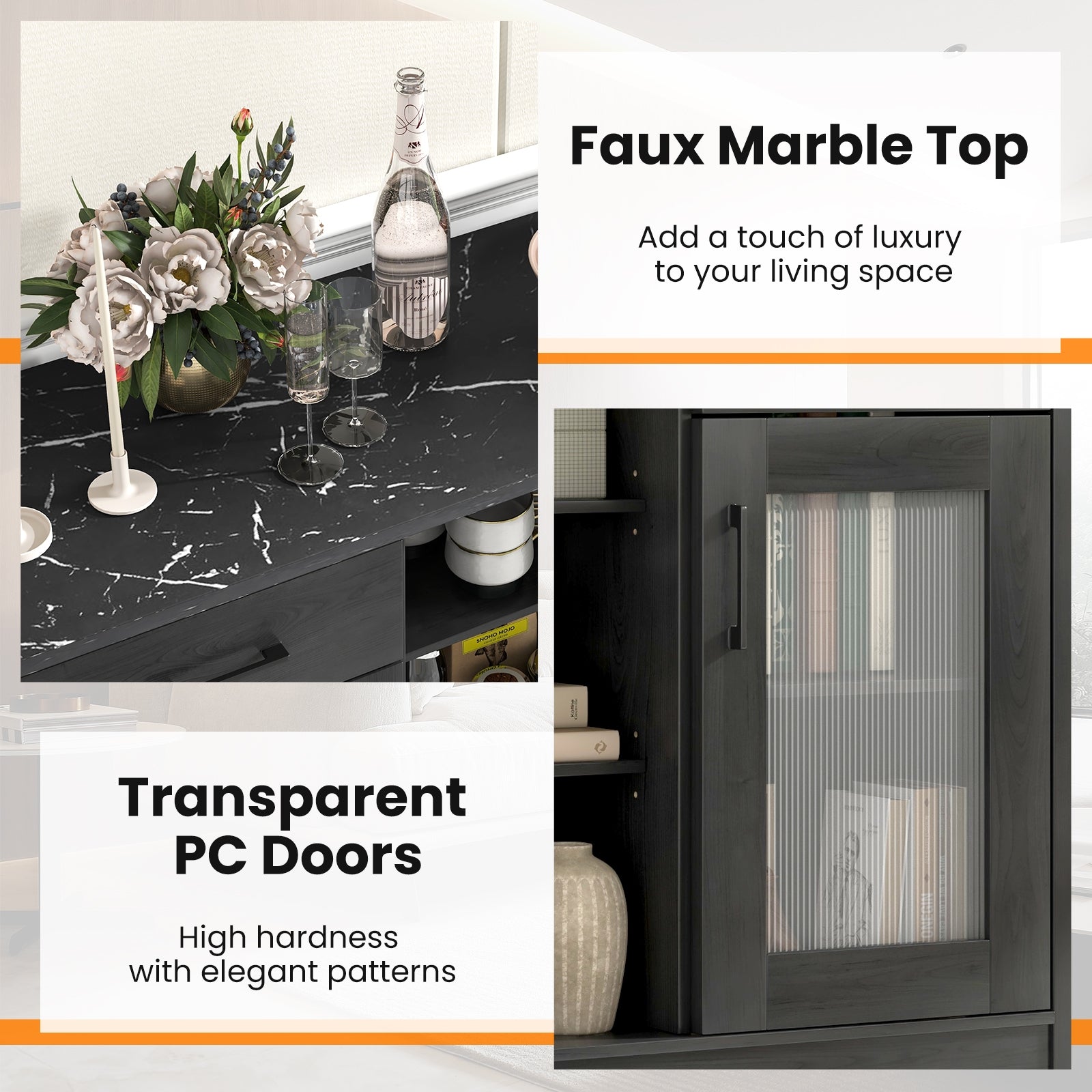 Elegant Design: Featuring faux marble top clear cabinet doors and elegant wood grains the kitchen storage cabinet combines functionality with timeless grace. Its sleek modern charm easily enhances the appeal of your living space regardless of its interior style.