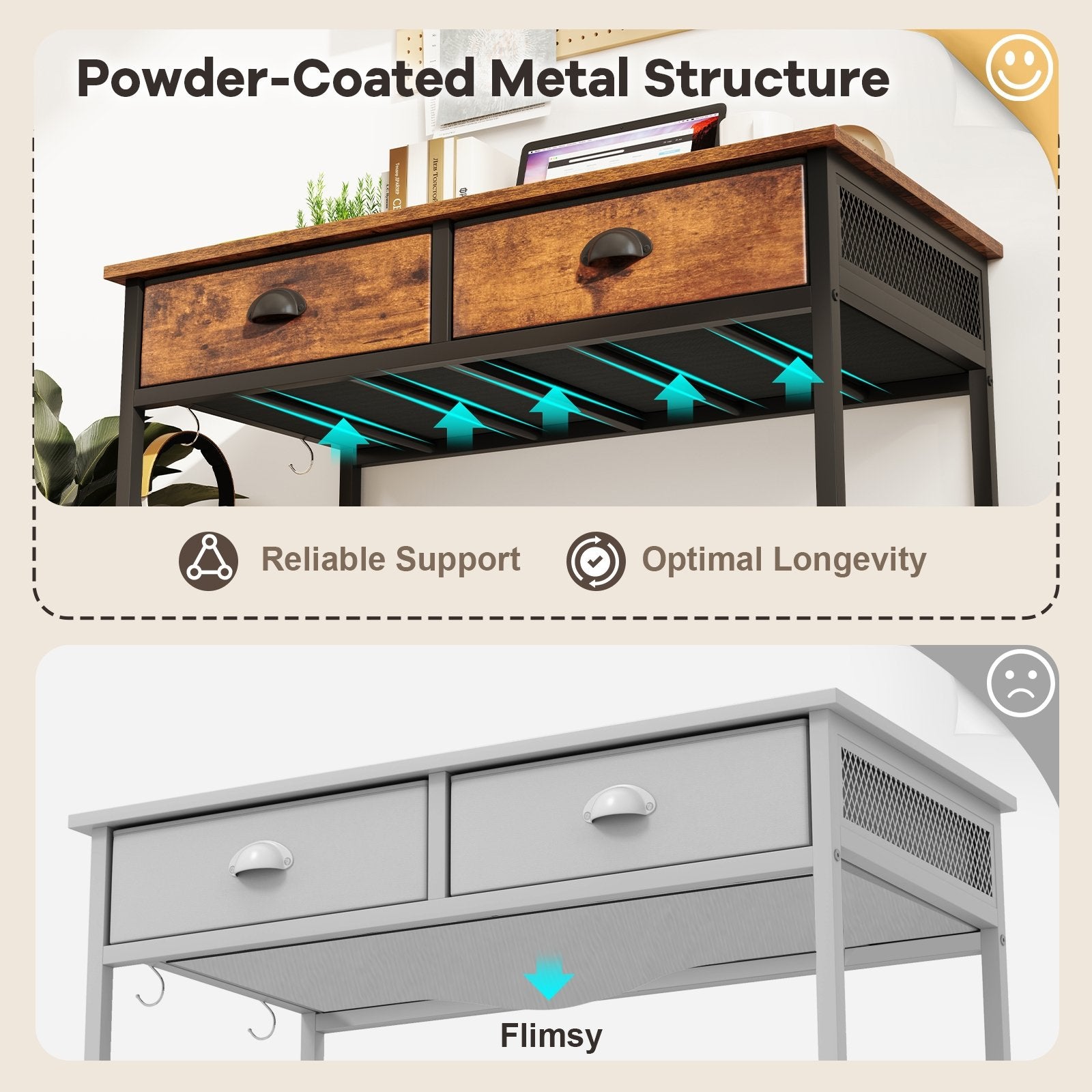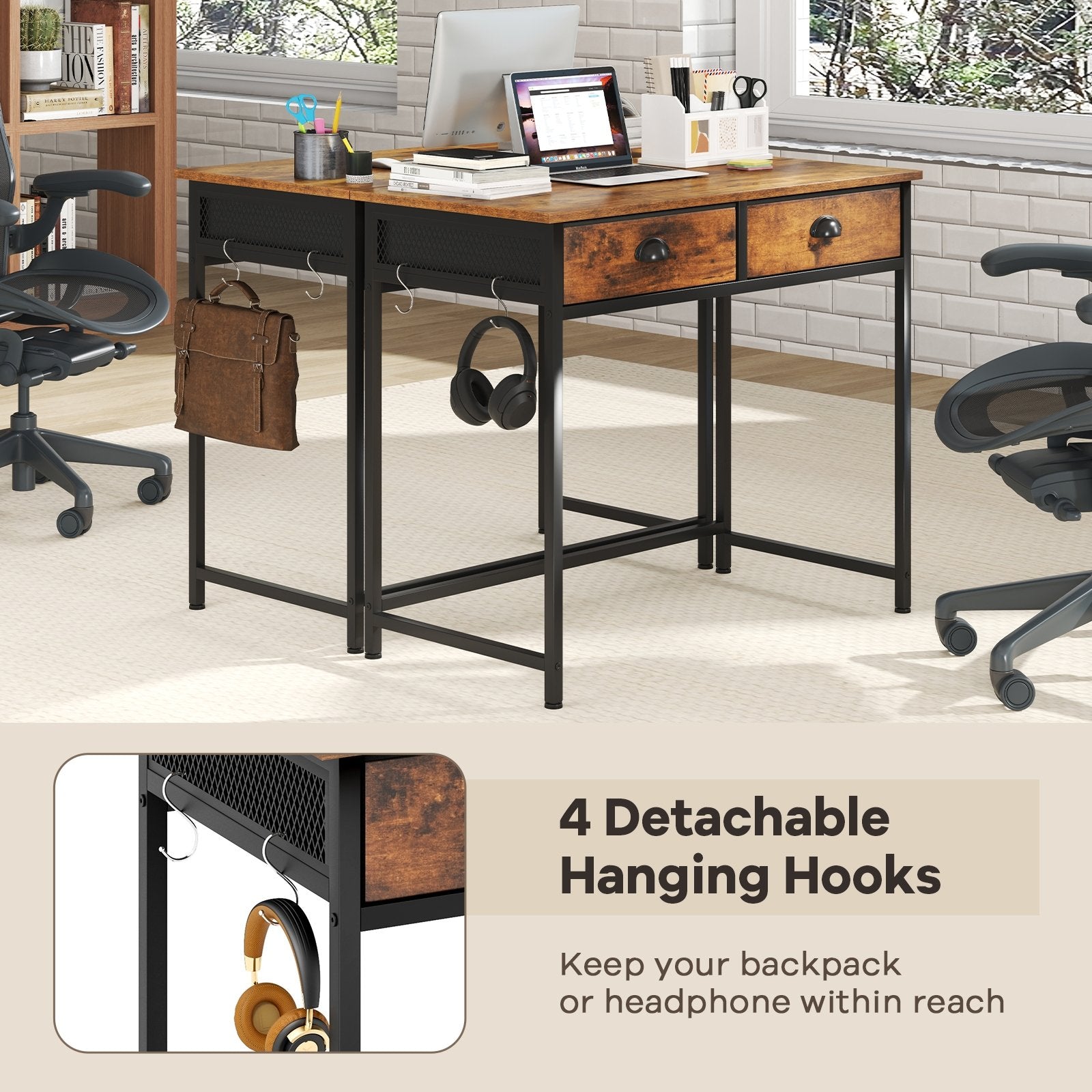 Space Saving Home Office Desk with 2 Fabric Drawers and 4 Hanging Hooks-Rustic Brown