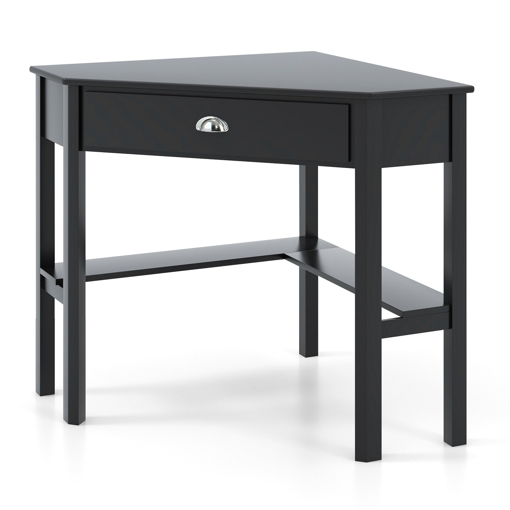 Compact and Corner Design: The design of this corner desk is classic and timeless. The corner desk can maximize space in compact rooms such as apartment dome study room or office. The corner desk comes with enough tabletop to hold a laptop or other daily supplier and there are one drawer and another bottom shelf to storage. The corner desk serves a variety of functions.