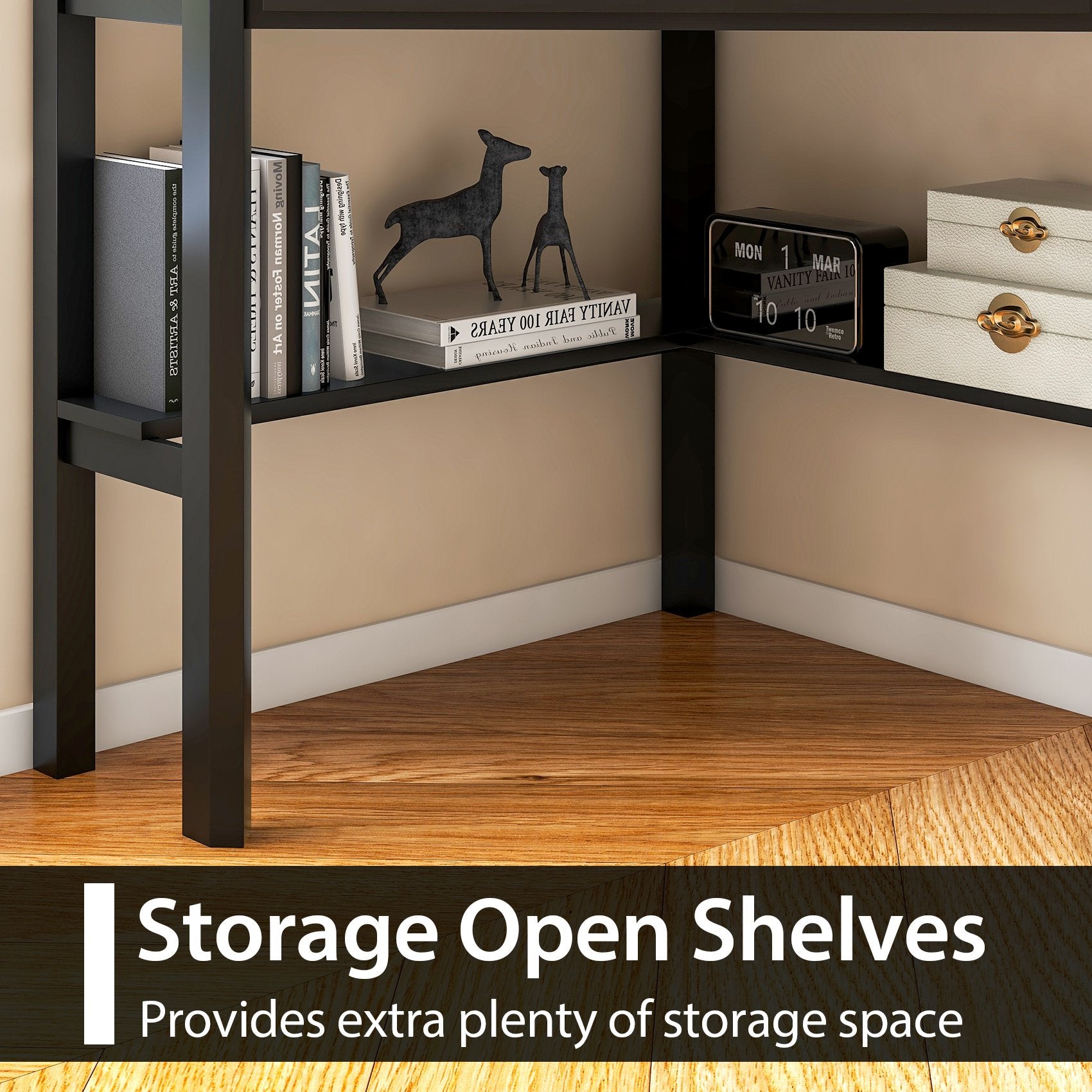 Storage Drawer and Shelves: This computer workstation comes with a big storage drawer and two open shelves on the side of the desk provide perfect space for you to place or lay aside your daily things.