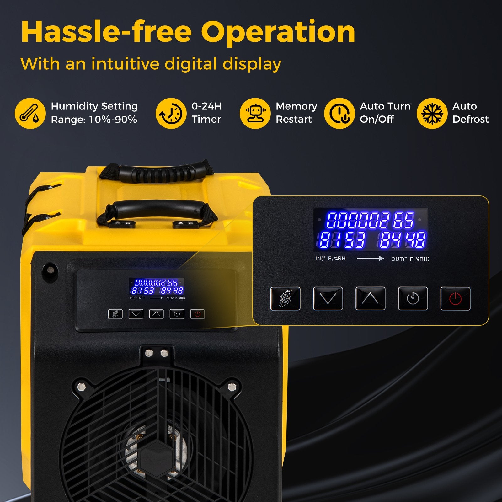 Hassle-free Operation: Equipped with a 0-24H timer humidity setting range of 10%-90% memory restart auto turn on/off and auto defrost function this dehumidifier offers customizable settings and great convenience. Plus it comes with an intuitive digital display for easy monitoring.