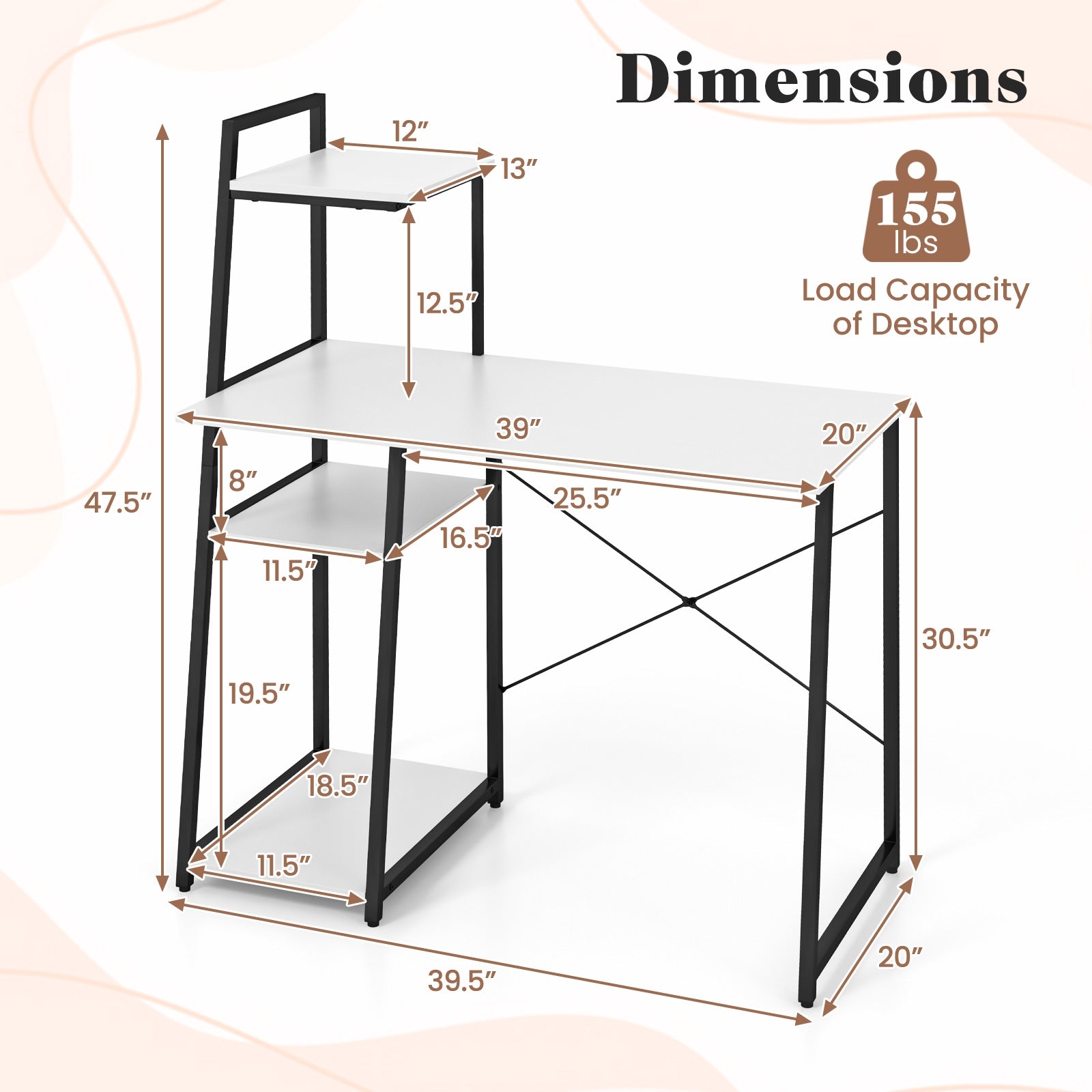 4-Tier Open Shelves: Considering that you may need more storage space that can not only display your beautiful ornaments but also make everything easily accessible the desk is equipped with 4 tier open-sided shelves.