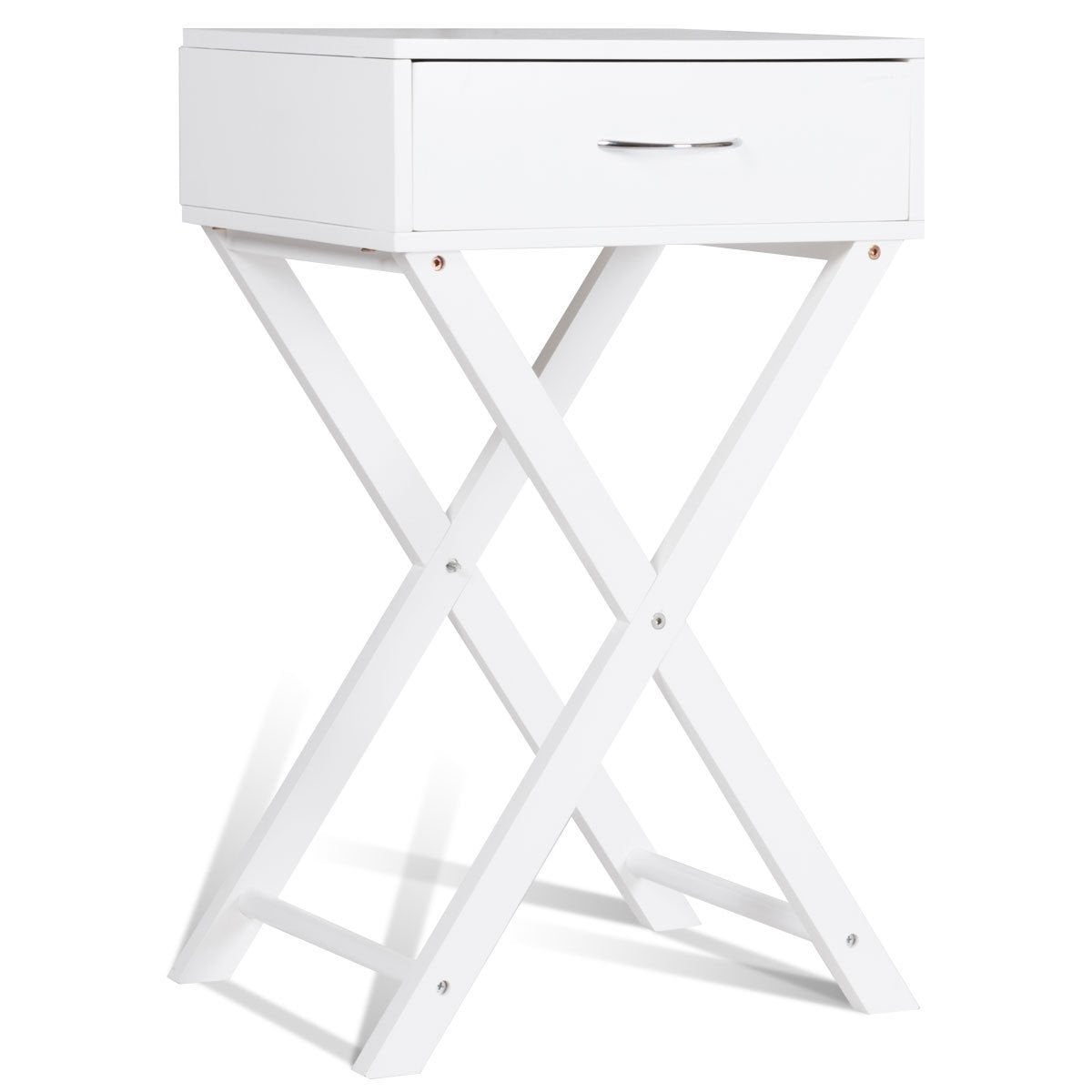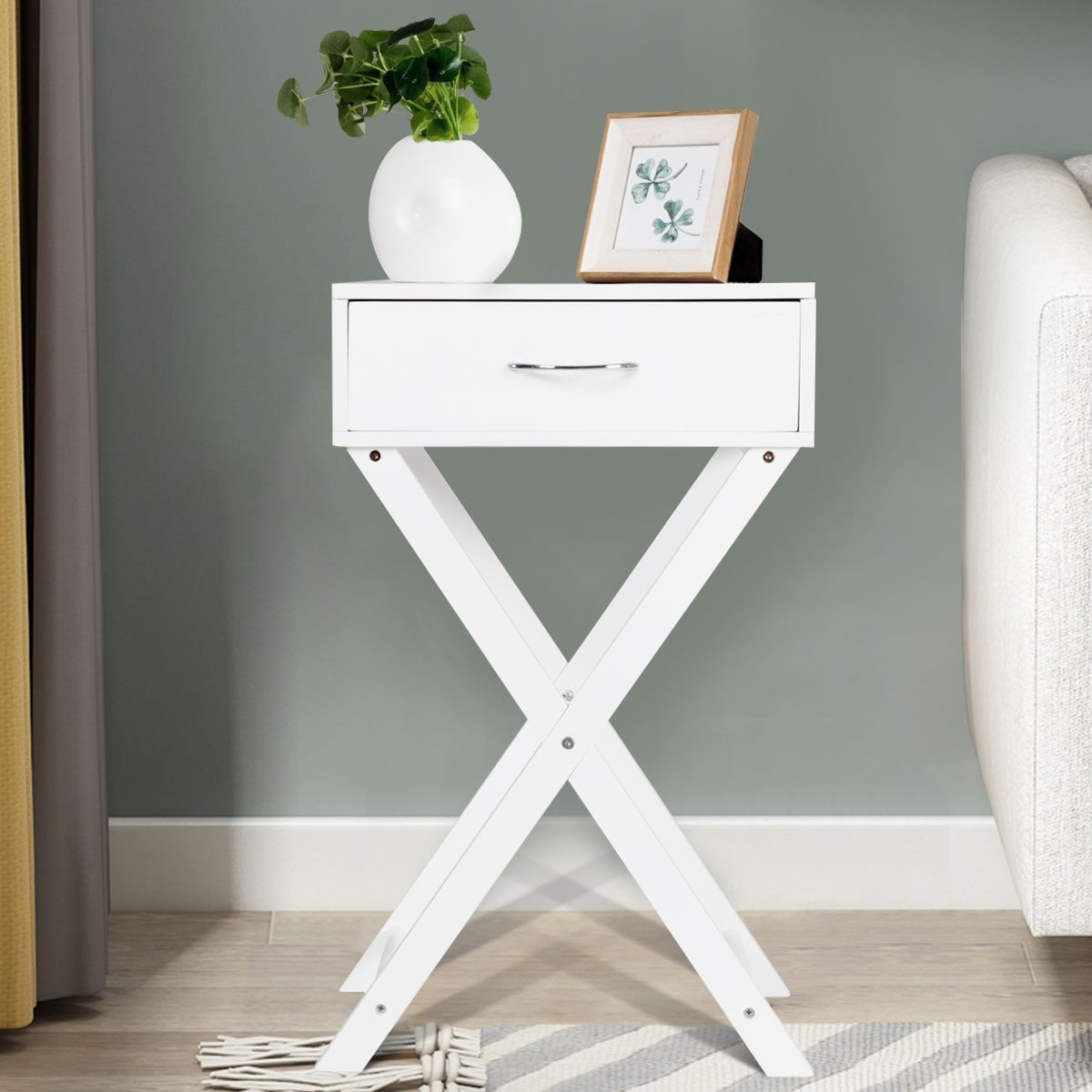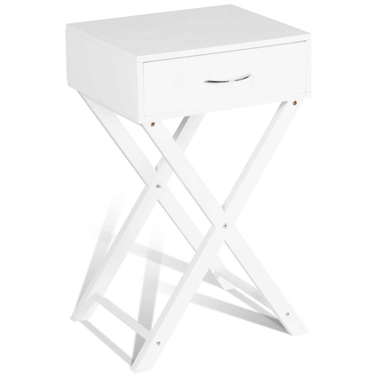 It is made of medium density fiberboard which makes this table more sturdy and stable. With an x base and spray-painted appearance this end table looks gorgeous and beautiful which can serve you for a long time. This end table is very useful. You can place it beside your sofa or bed or put it in your dining room and put things that you need on it. For example you can put your telephone set cups magazines photo albums etc. It is really convenient for you to do so. And it has a useful drawer. You have enough space to put your little things. This x base end table can also be a fine decoration of your home.