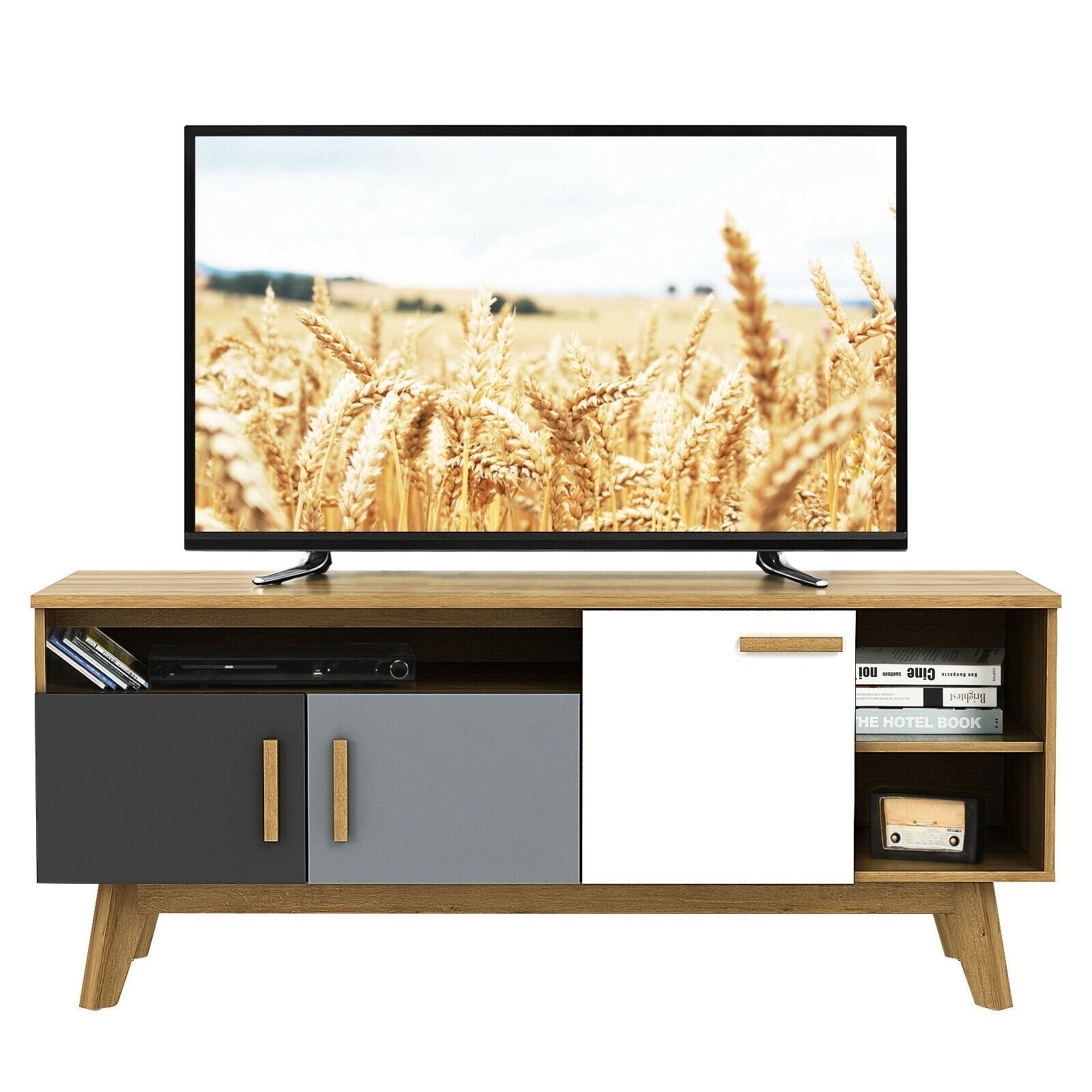 This TV cabinet is made of sturdy material so its overall load-bearing capacity reaches 165lbs. In addition the dimension of TV stand top is 58" x 16". Thanks to these features the TV console can accommodate TVs up to 65 inches. Besides it is also a perfect storage helper. Combining open adjustable shelf and enclosed compartments the entertainment center provides ample storage space for different items from DVD players to books from ornaments to gaming devices. At the back of media console there is a wire hole helping you organize different wires. Undoubtedly the TV console looks relatively fashion which allows you to place it in different places for added charm.
