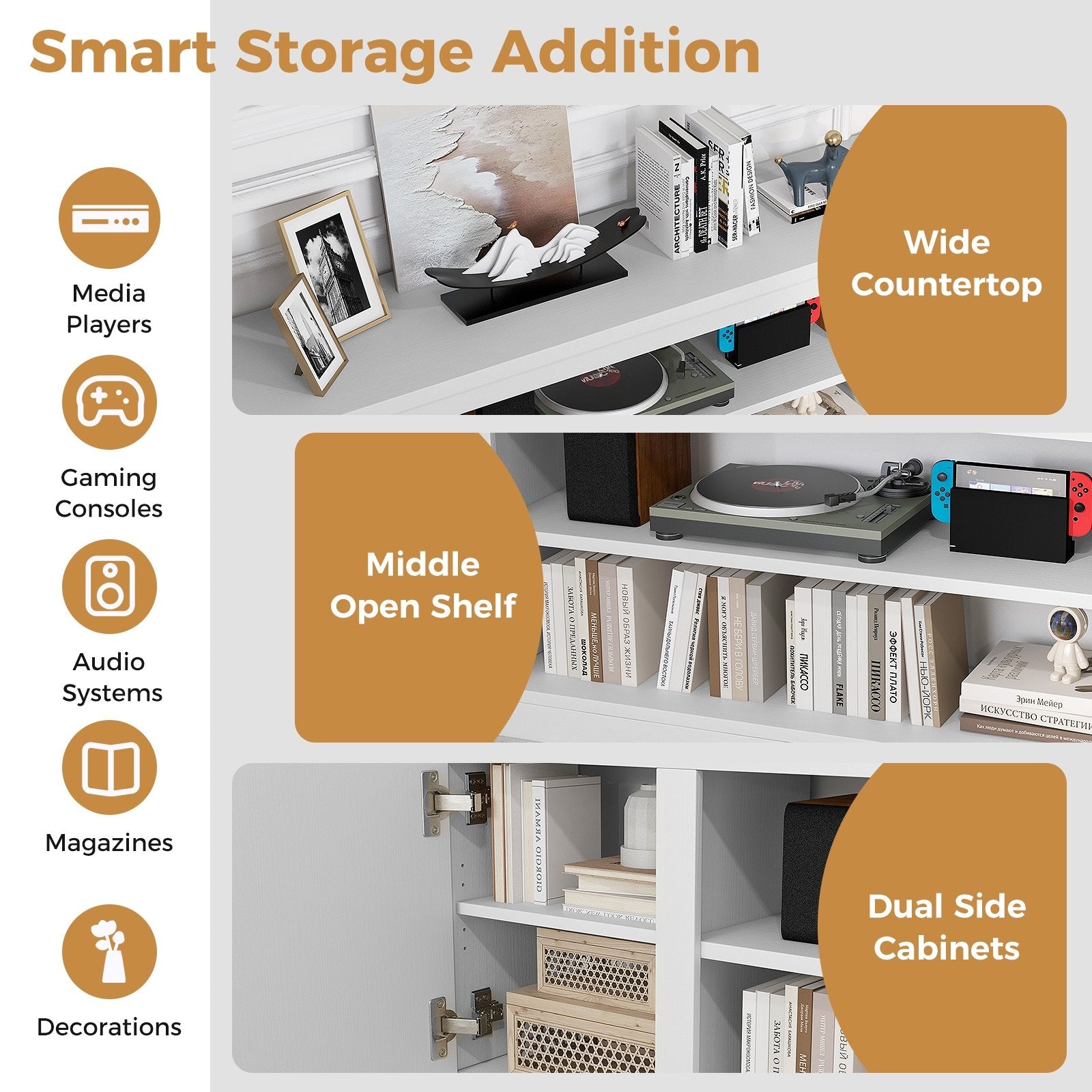 Smart Storage Addition: Thanks to the efficient storage system of the media console table it is convenient to organize your media players magazines and audio systems with open shelves and 2 enclosed cabinets.