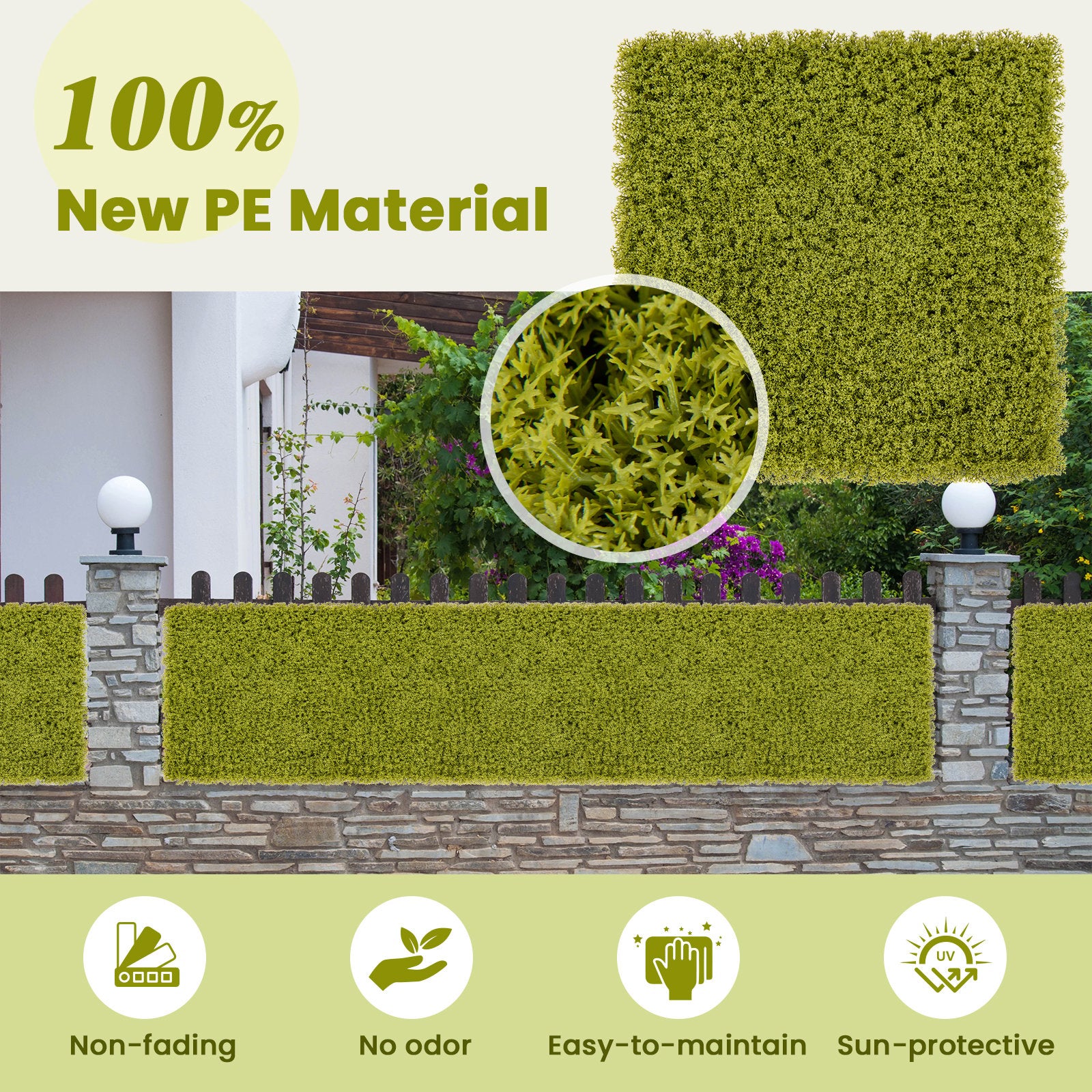 Long-Lasting PE Material: The artificial hedge plants are made of high quality PE which is smell-free and allergic-proof ensuring safe use in indoors and outdoors. Besides the selected material is fade-resistant and sun-protective promising prolonged exposure in outdoors.