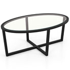 Glass Coffee Table Oval Living Room Table with Cross Base and Acacia Wood Legs-Black