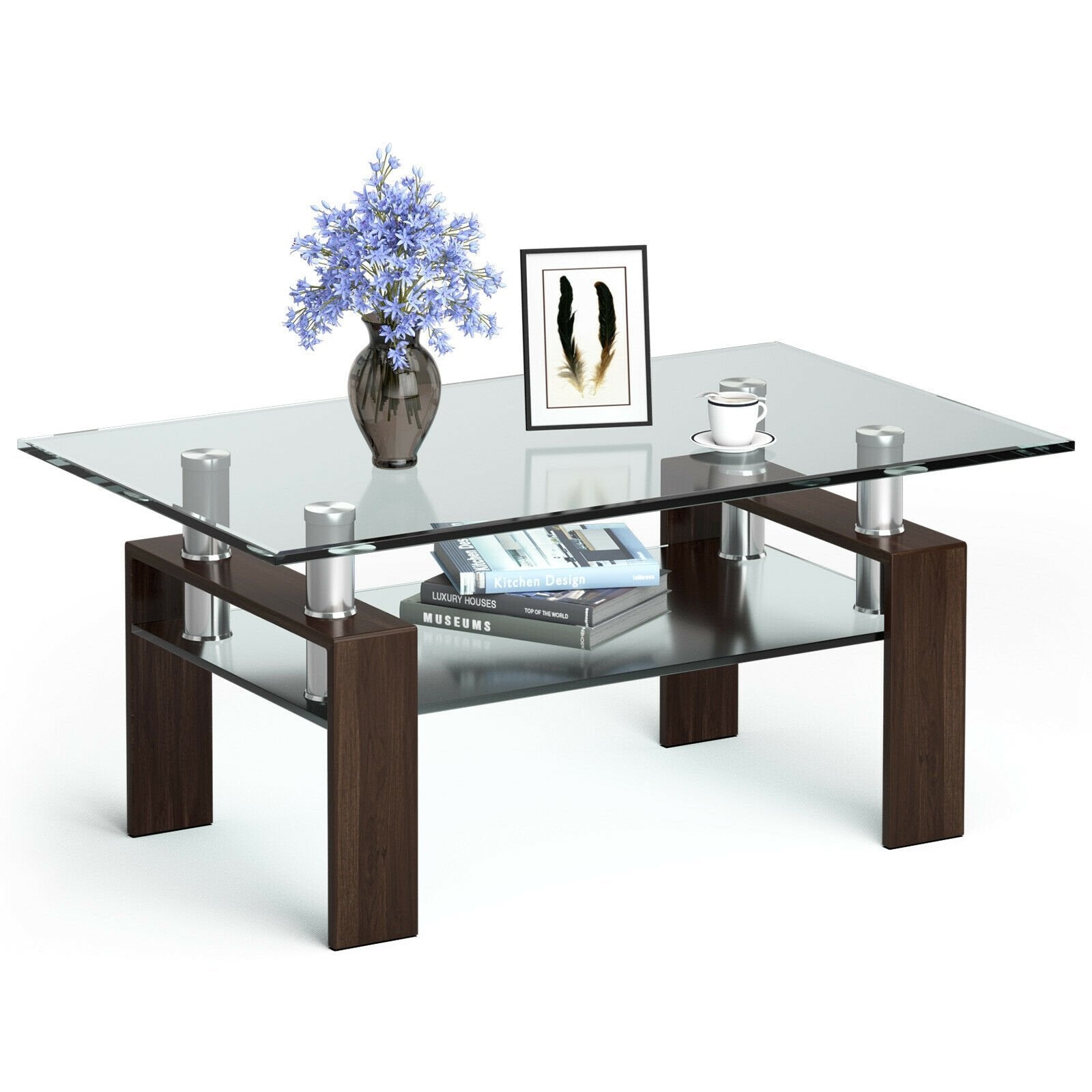 2-Tier Coffee Table Rectangular Center Table with Tempered Glass Tabletop and Storage Shelf-Natural