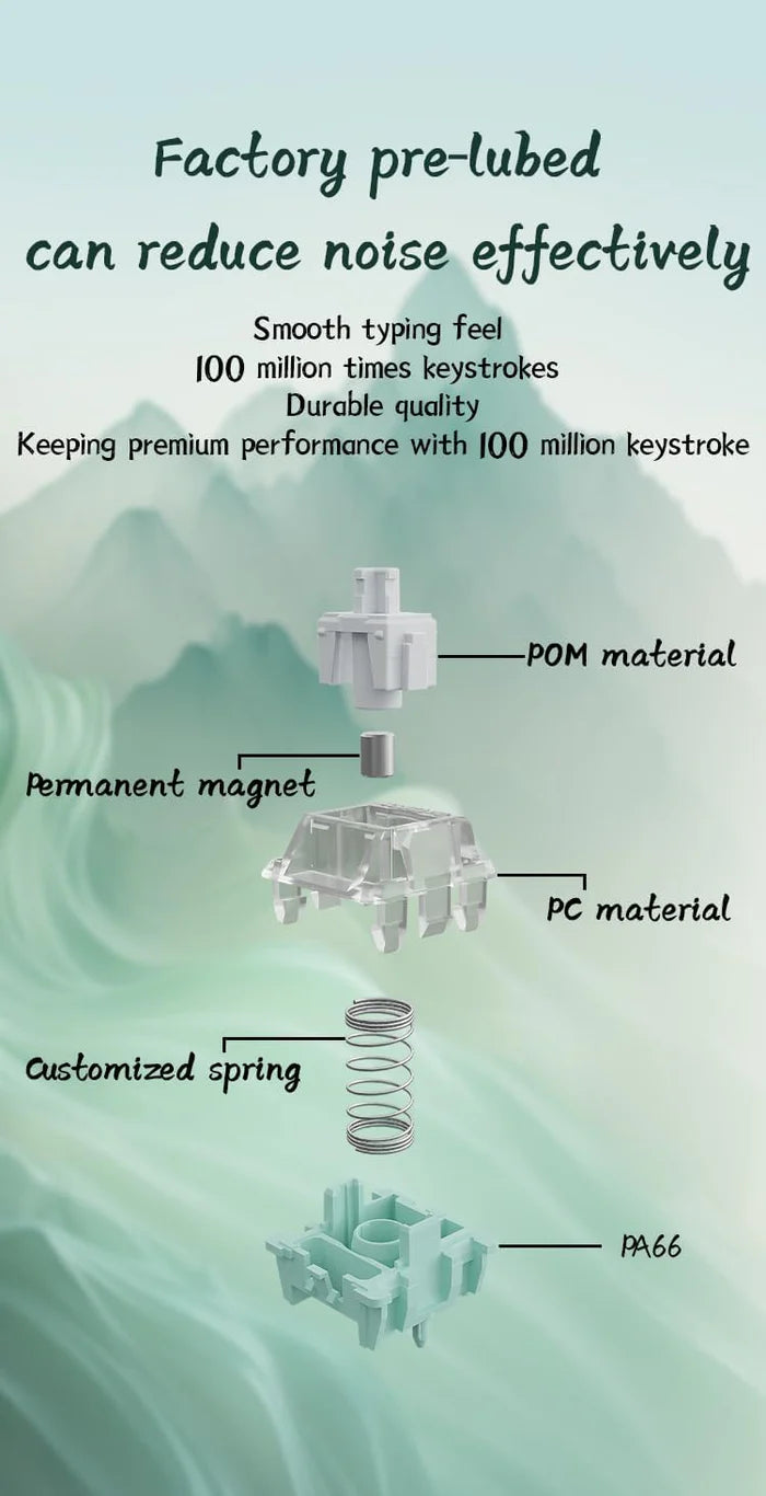 The Magnetic Jade 70PCS Switch Pack brings precision and performance to your mechanical keyboard with the latest in magnetic Hall Effect technology. Perfect for gamers and work-from-home professionals, these switches deliver ultra-smooth, responsive actuation with zero latency, ensuring fast, accurate key presses. Thanks to the contactless design, these switches are incredibly durable, minimizing wear and tear for long-lasting use. Whether you're in the middle of an intense gaming session or typing for hours on a project, Magnetic Jade switches provide the perfect balance of speed, reliability, and quiet operation, making them a top choice for any setup.
