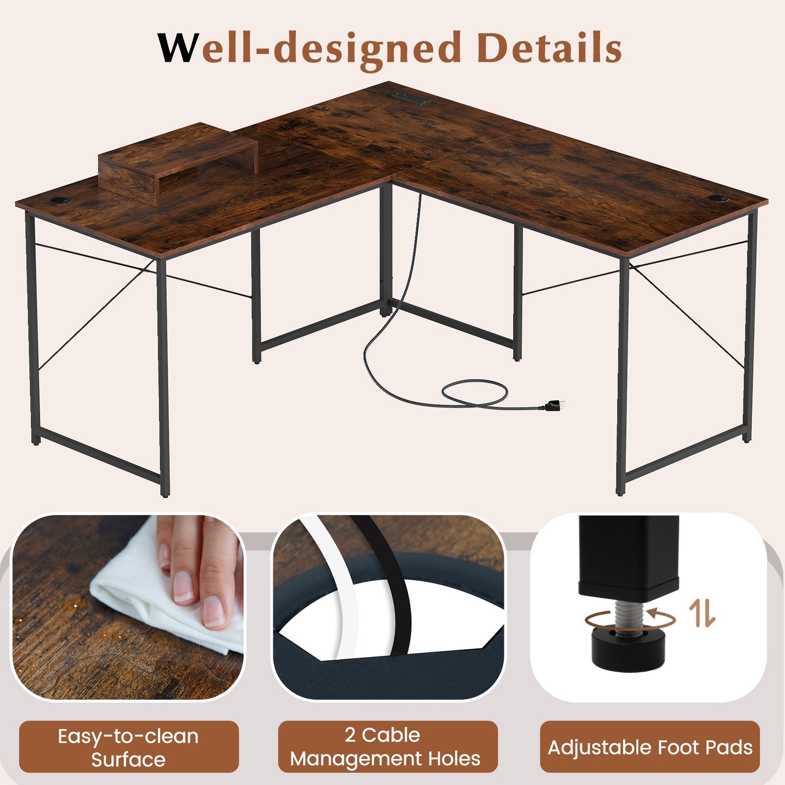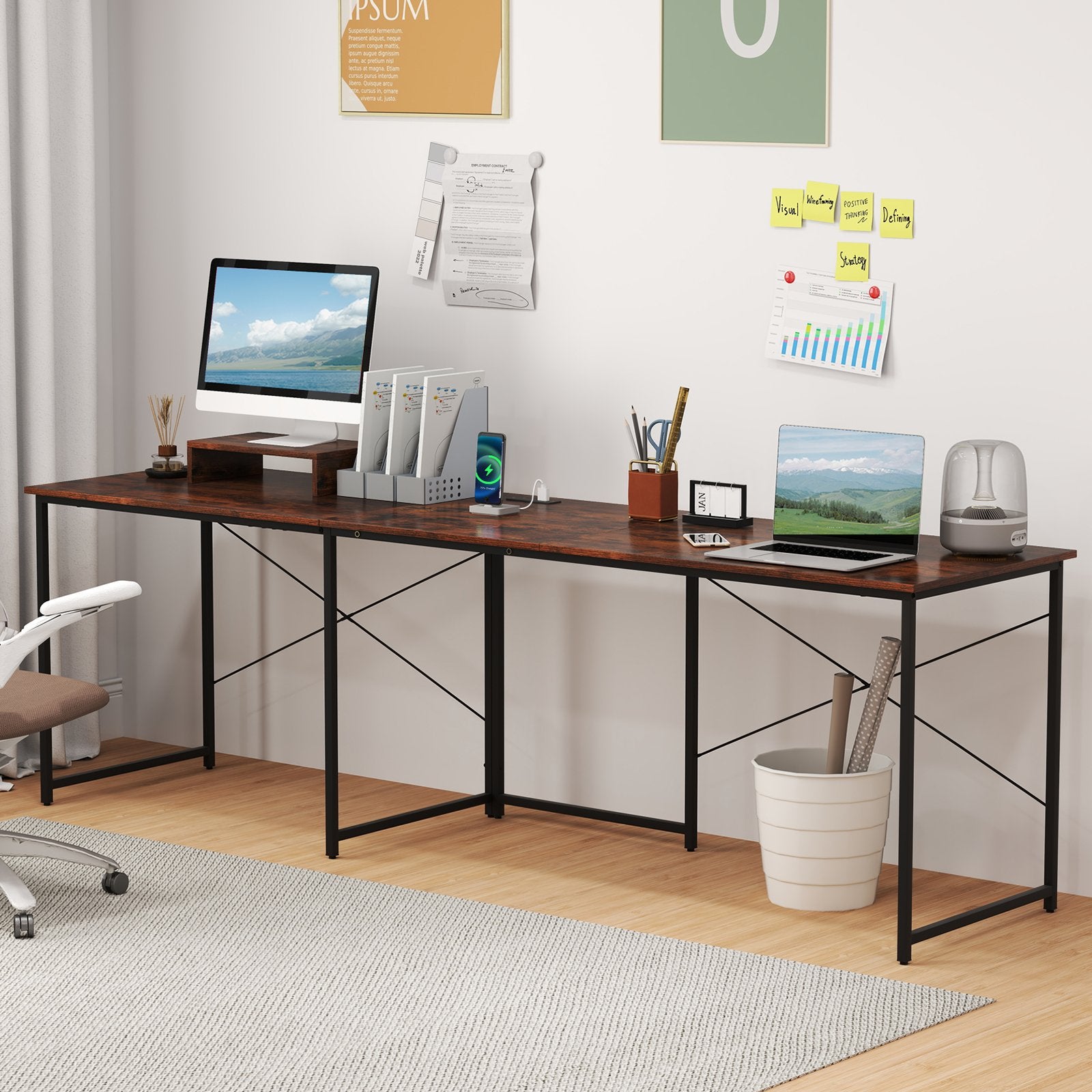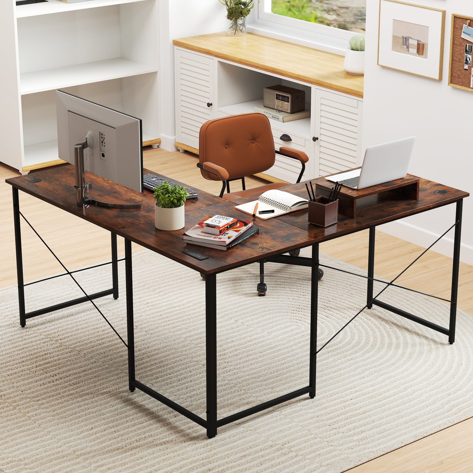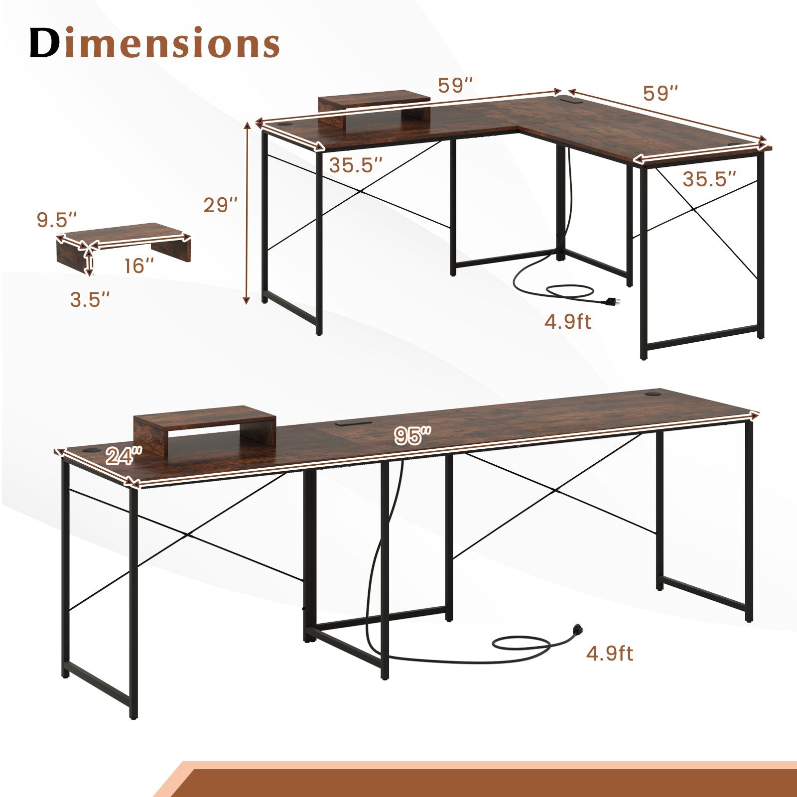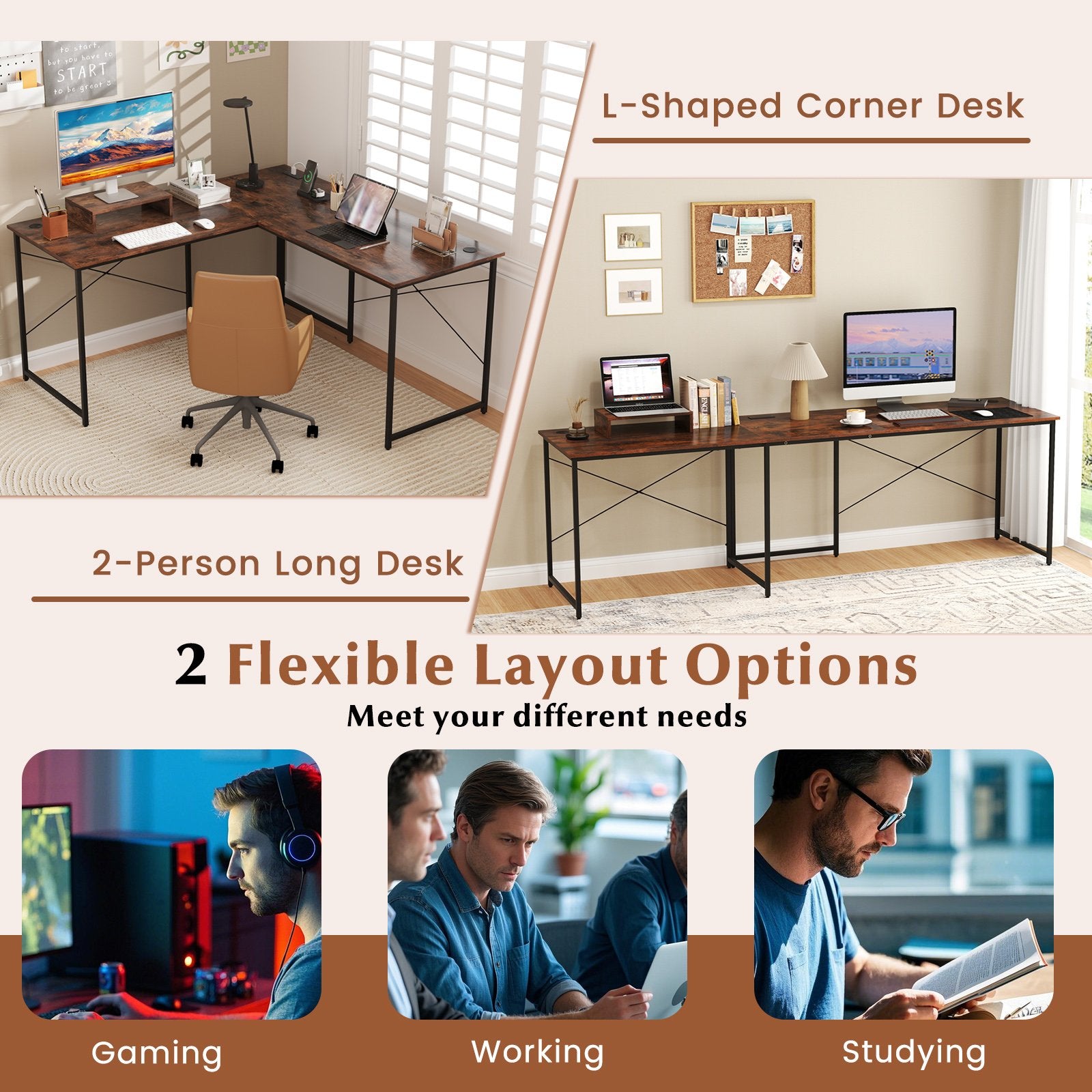 95 Inch 2-Person L-Shaped Long Reversible Computer Desk with Monitor Stand-Rustic Brown