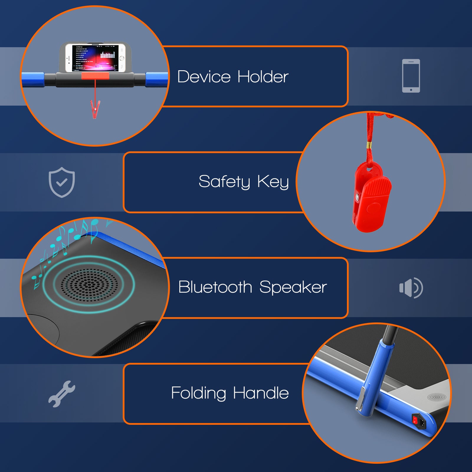 Innovative 2-in-1 Folding Treadmill: Compared to ordinary treadmills the 2-in-1 treadmill has 2 modes to meet your different sports needs so you can easily have a healthy body. When the riser is folded it can be used as an under-desk treadmill at a speed of 1-4km/h so you can do other things while walking. When the riser is raised the running speed is 1-12km/h and you can run to reach your fitness goal.