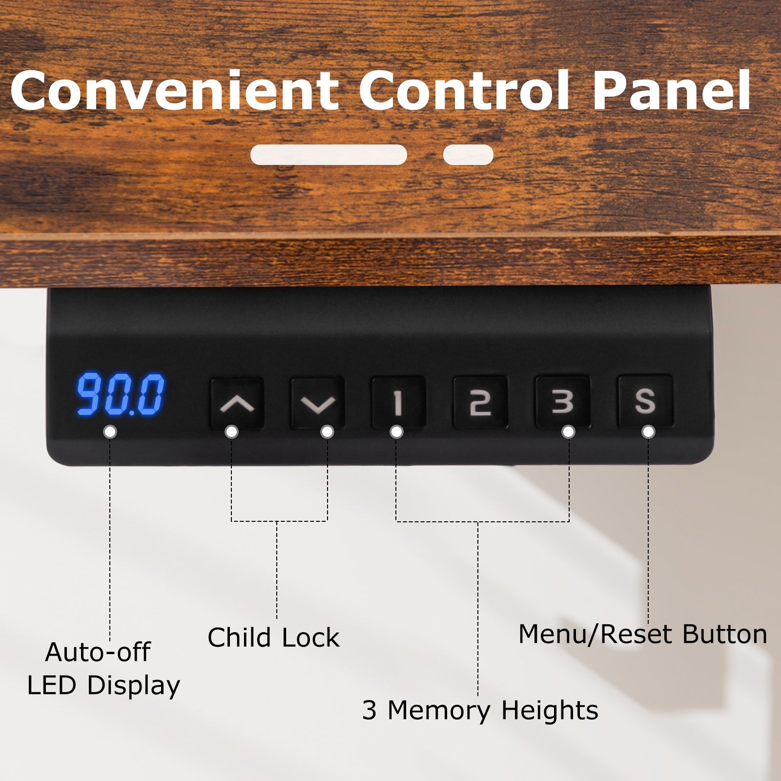 Smart Control Panel: Elevate your workspace efficiency with the intelligent control panel! There’s an LED display for easy height viewing 3 memory settings to save your favorite positions and a menu/reset button ensuring the adjustable table adapts to your preferred settings with ease.