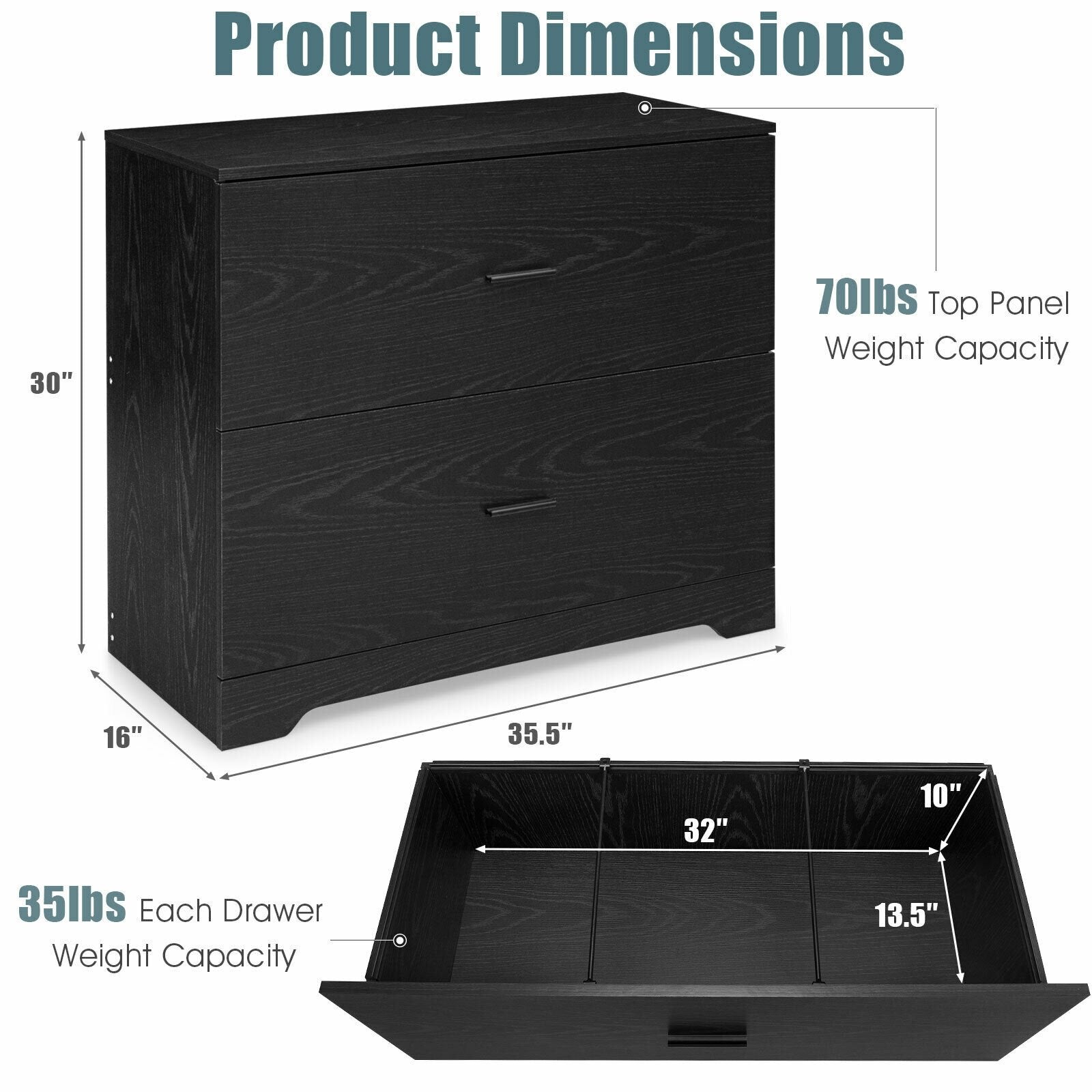 - Each drawer weight capacity: 35 lbs
