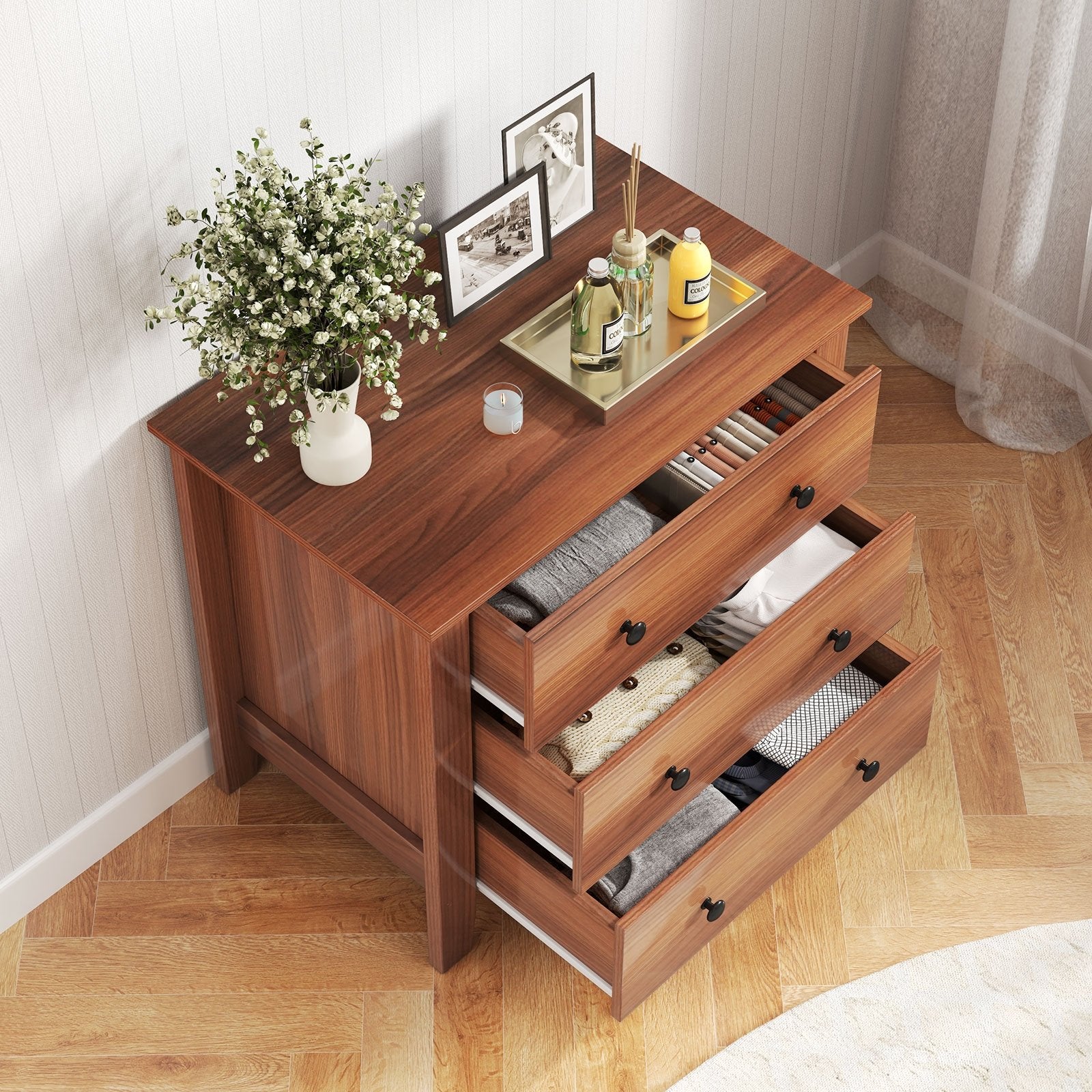 Coming with large 3 drawers this dresser chest would bring more storage space for daily bedroom storage. The suitable height of the dresser not only helps you keep the essentials of the bedroom organized but also allows articles of daily use properly stored whether to your bedside or your entryway. A Super mute slide guide means that you can pull open the drawers with ease even you are holding your clothes full of your hands!