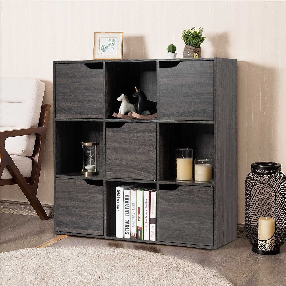 - -9-cube organizer cabinet provides storage and display space