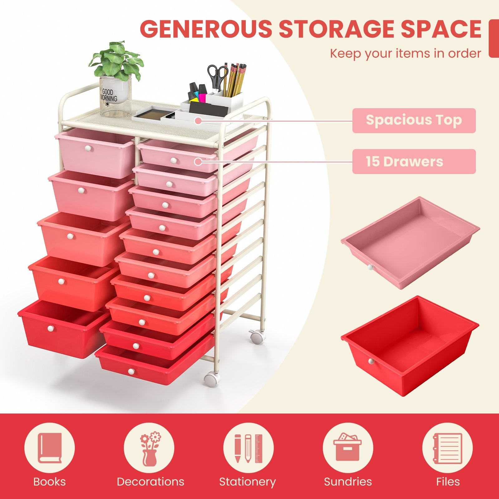 15 Drawers with Sufficient Storage Space: The rolling storage cart consists of 5 big drawers and 10 small drawers. They all provide ample storage space for your various items to keep them organized as well. The small round handle adds convenience in the drawers' operation.