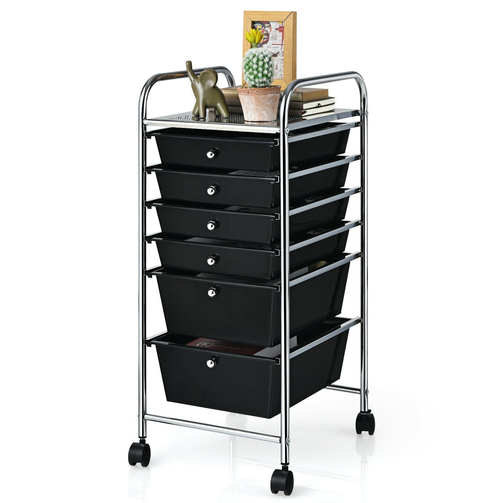 This freestanding drawer cart features 6 plastic drawers with silver drawer pulls and durable sleek metal frame sitting on sturdy casters. Shallow deep drawers made from sturdy colorful clear plastic make all your items easily viewable while removable casters provide effortless mobility. Its multiple color scheme is sure to fit in with any decor. Keep it in your office for sorting files mail and other supplies. Store it in your kitchen for recipes gadgets and dish towels. Place this handy unit in your garage or workshop for organizing tools screws and other hardware. Great in a classroom for keeping arts and craft supplies in one easy place. You could even use it in a retail setting for sorting back stock items or paperwork. With so many options for this sturdy drawer trolley.