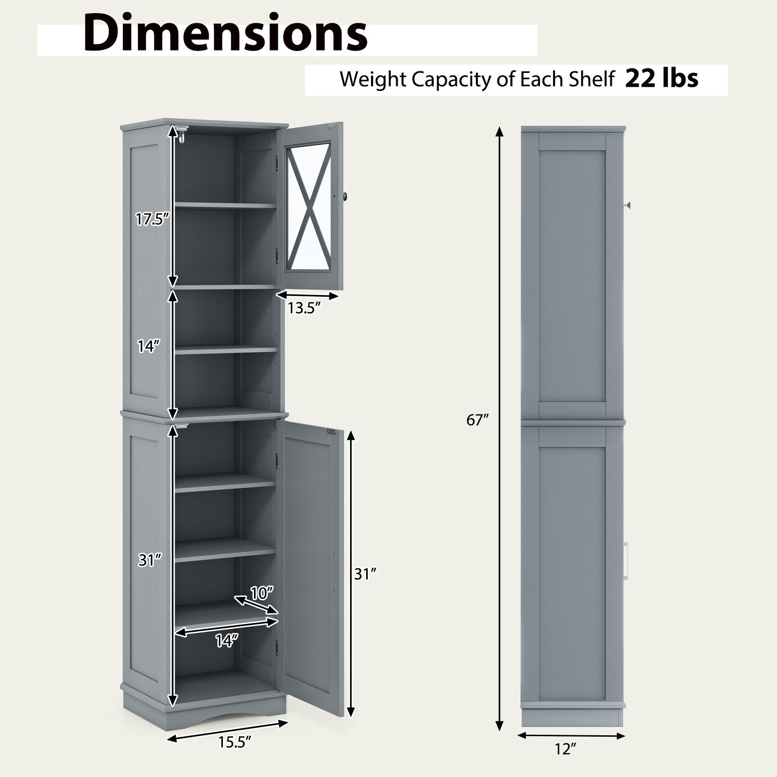 Compact Design for Small Spaces: Measuring 15.5" x 12" x 67" (L x W x H) our freestanding high cabinet takes up little floor space and fits effortlessly into narrow corners. Its compact design saves space without compromising on storage capacity making it ideal for small rooms.