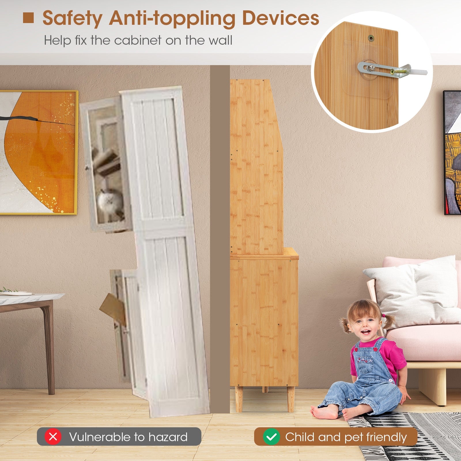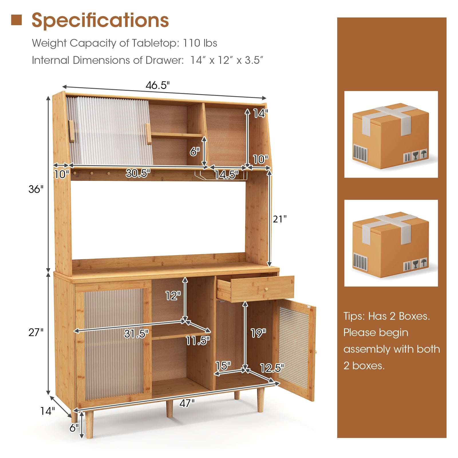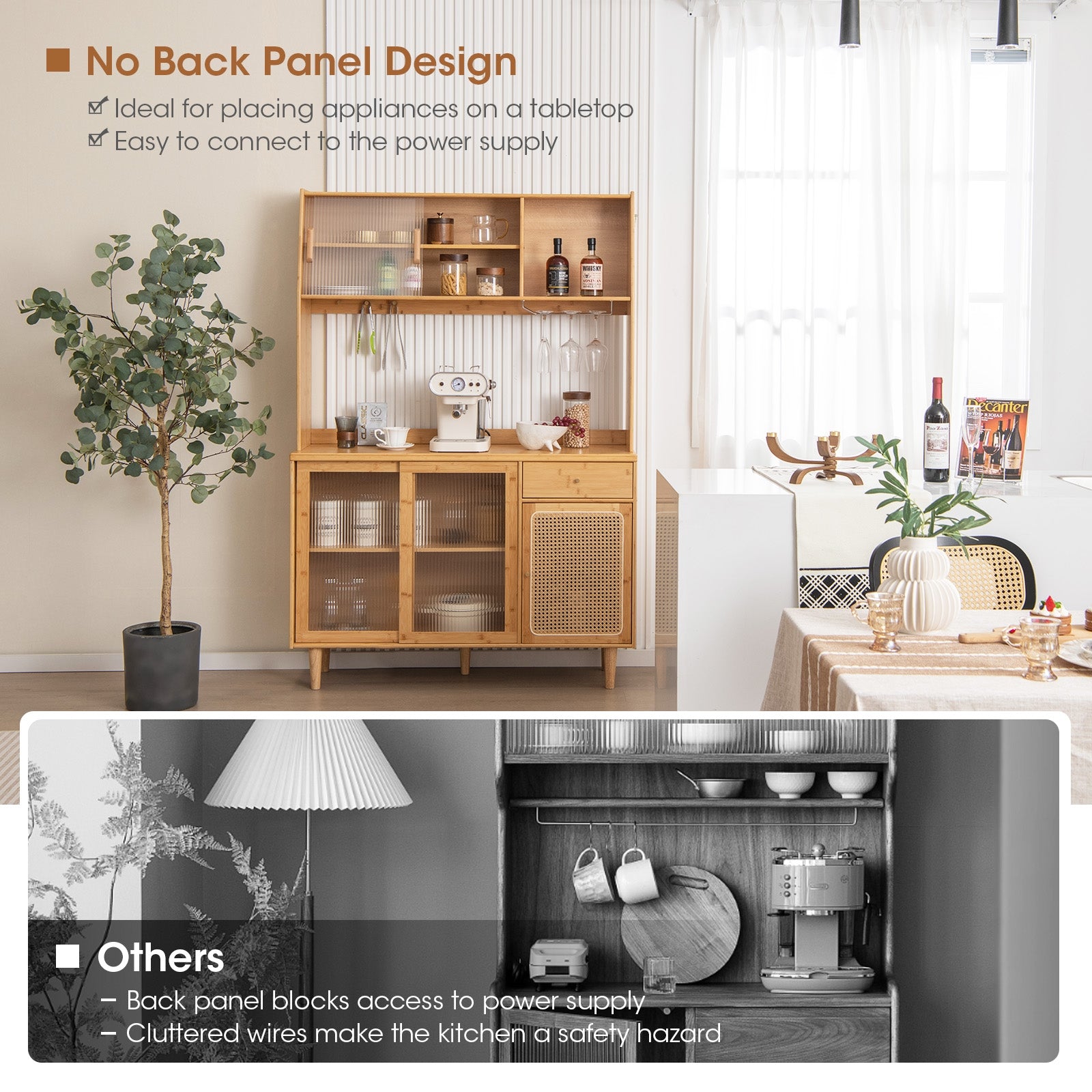 Quality Materials and Reliable Structure: The freestanding kitchen cabinet is made of selected bamboo for long-time use. High quality rattan enables better durability and ventilation. Tempered glass doors give the cabinets a unique charm. And it is equipped with anti-toppling devices and anti-slip foot pads for extra stability.