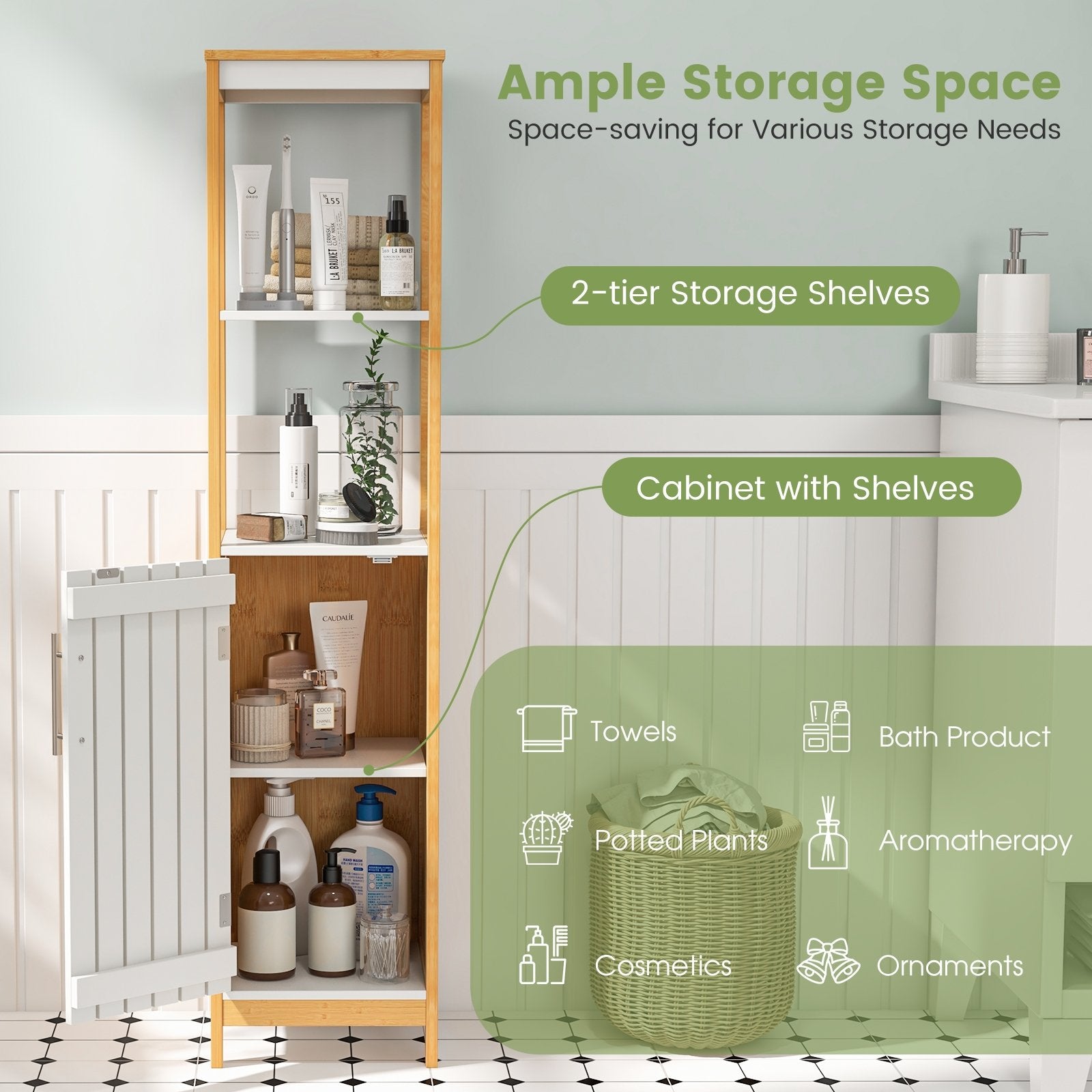 Simple Yet Elegant Design: The sleek appearance consists of a slatted door which adds a rustic feel to your space. Besides the bamboo material brings a touch of nature. This versatile storage organizer is suitable for bathroom laundry room living room and more.