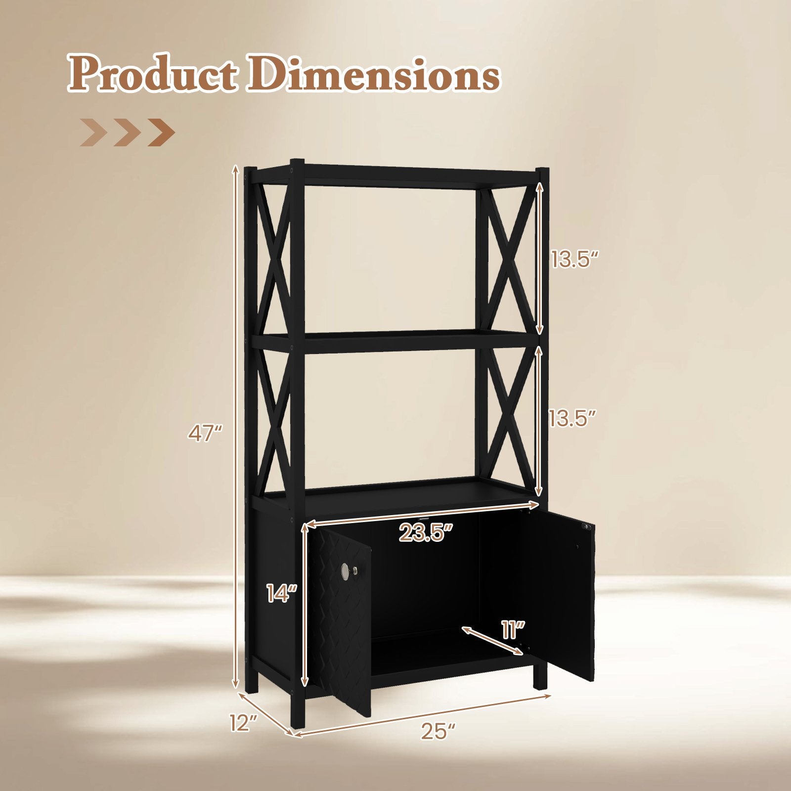 Timeless Elegance: This modern bookshelf comes with decorative X-shaped bars on both sides which not only enhance aesthetics but also increase the structural strength of the frame. Moreover the embossed doors also add a touch of elegance.
