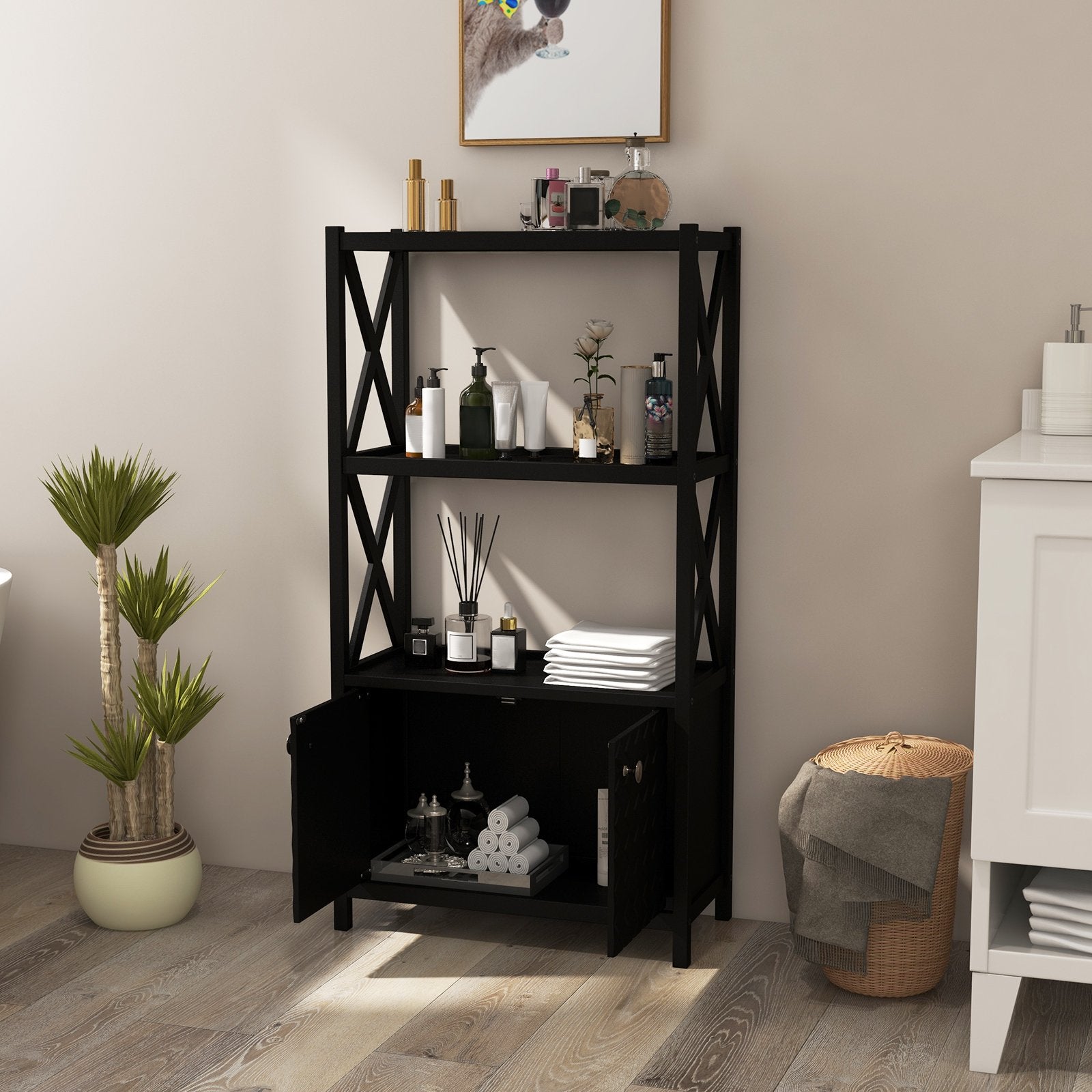 Bathroom Storage Cabinet with Open Shelves and Double Doors-Black