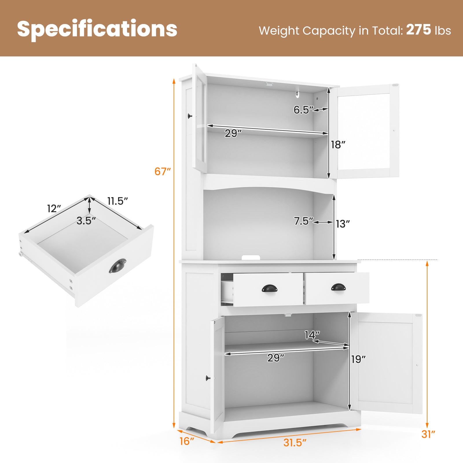 Large Storage Space: Consists of an upper cabinet with a glass door an open countertop two deep drawers and a large bottom cabinet this cabinet closet is suitable for storing books tableware toiletries or cosmetics. In addition the large metal handle facilitates the opening and closing of the cabinet door.