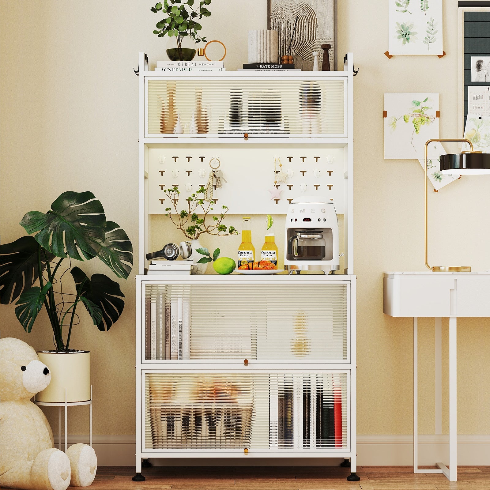 5 Tier Kitchen Bakers Rack with Lights Multifunctional Microwave Stand with Flip Door Cabinets-White
