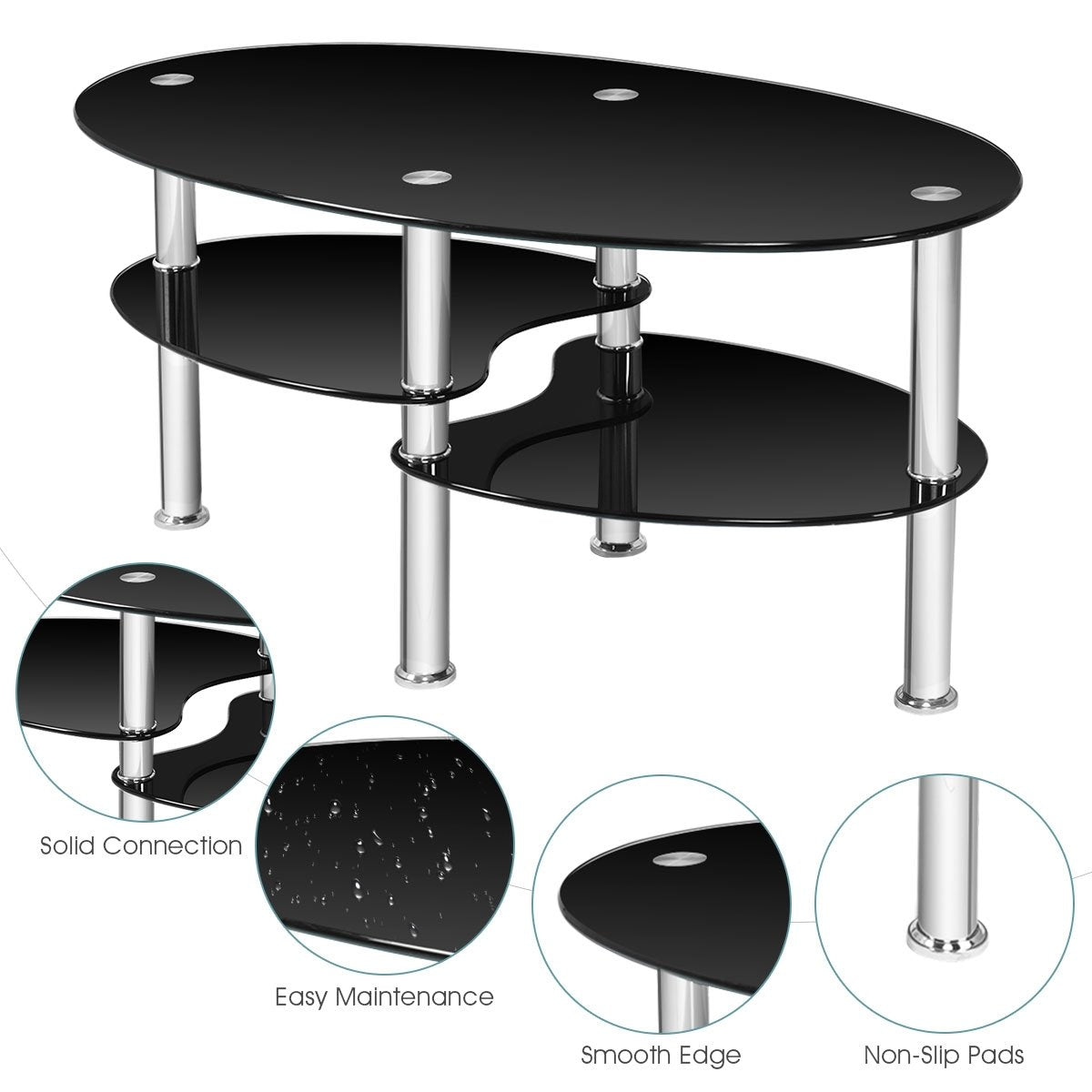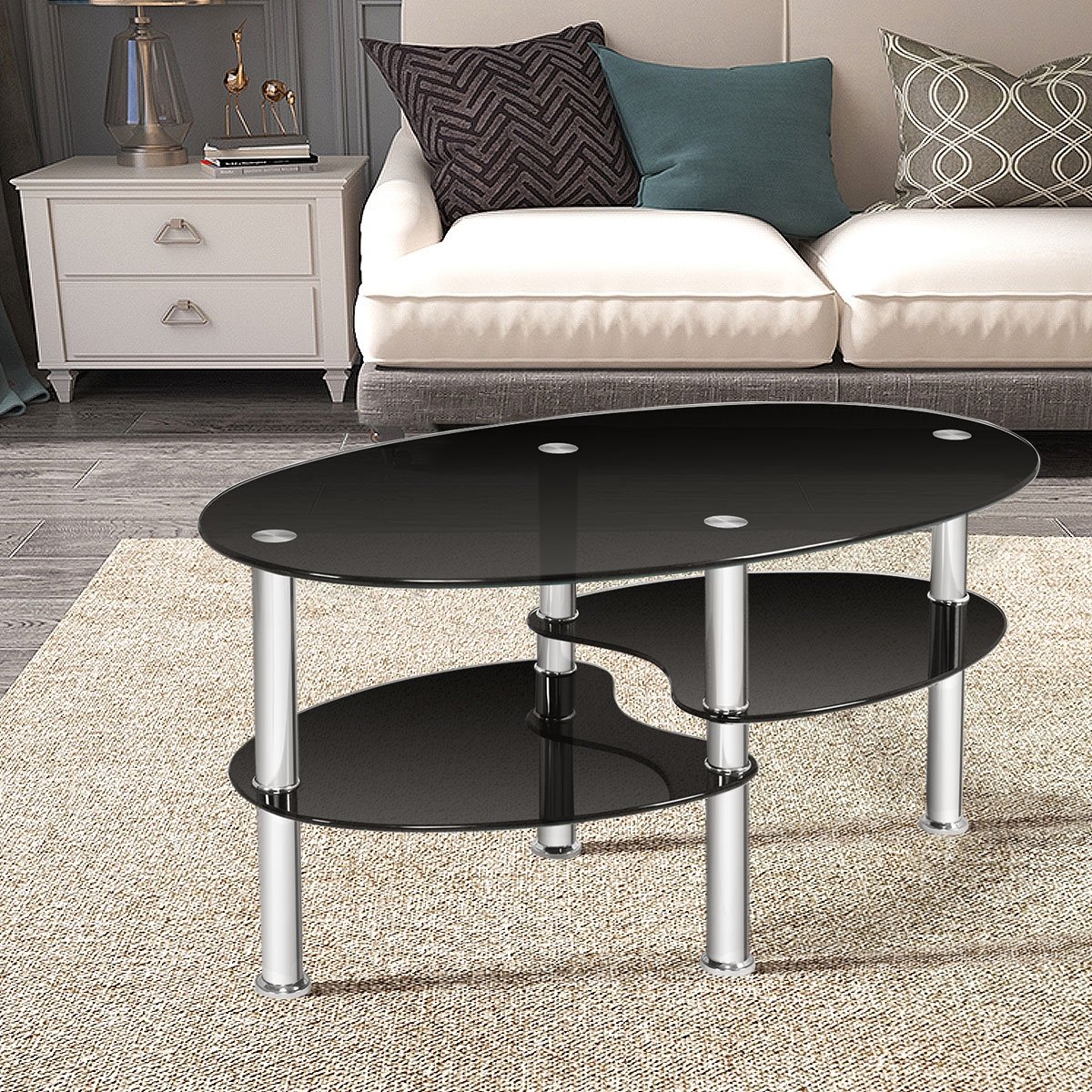 Modern and Compact Appearance: Glass coffee table comes with double shelves and irregularly boards. The oval shape looks modern and you can put your tea cups flowers and books on the first shelf the second shelf could used as storage shelf. It saves much space.