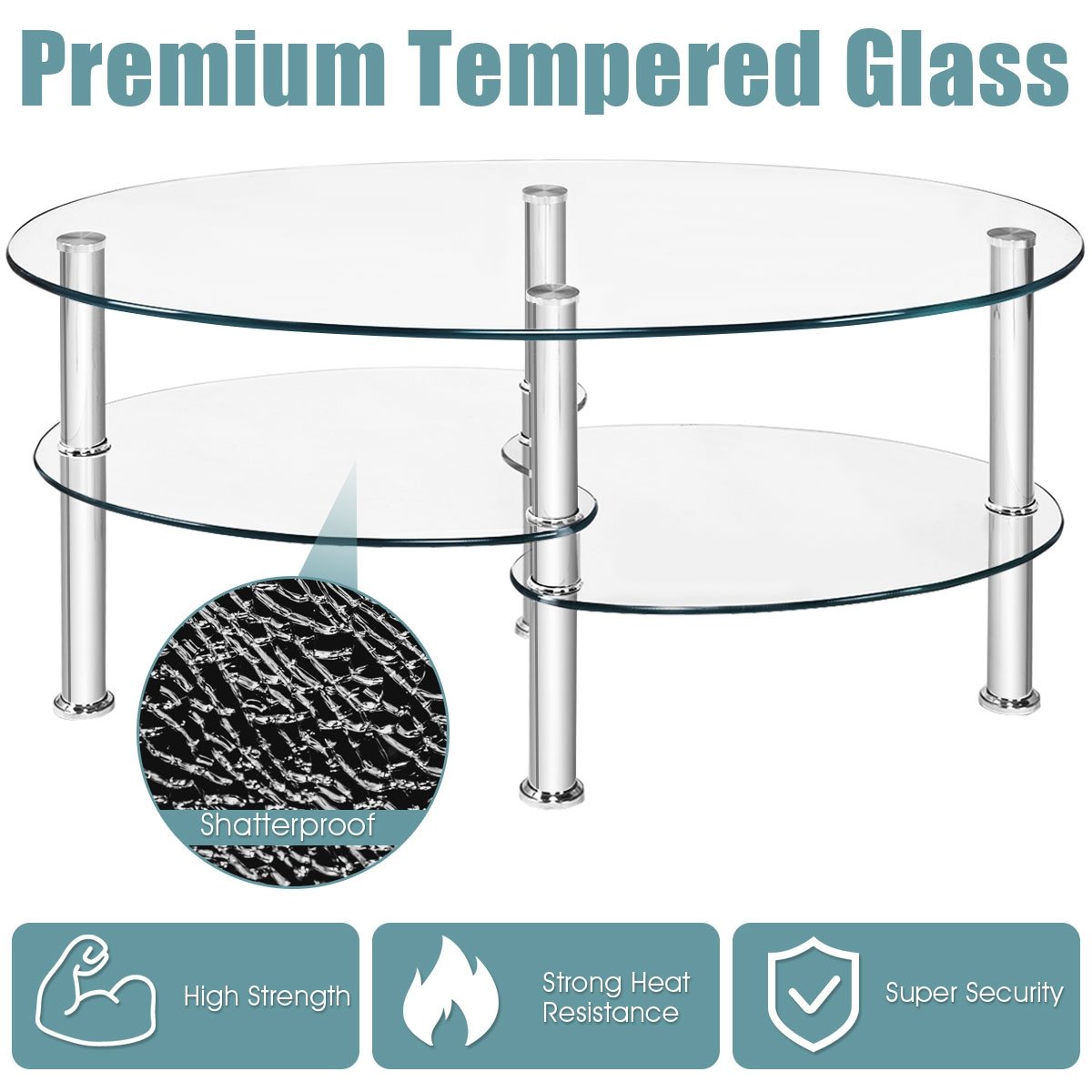 Modern and Compact Appearance: Glass coffee table comes with double shelves and irregularly boards. The oval shape looks modern and you can put your tea cups flowers and books on the first shelf the second shelf could used as storage shelf. It saves much space.