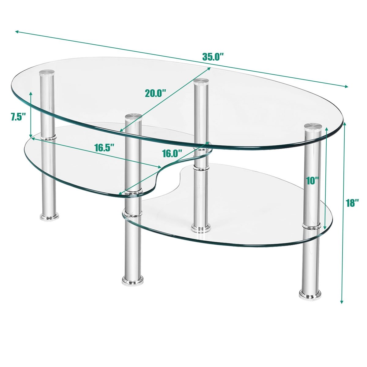 Installation and Dimension: This glass coffee table is easy to install. And all tools are included. Dimension: Overall dimension: Overall dimension : 35.5" x 20" x 18" (L x W x H) dimension of the two Bottom shelf: 16.5"L x 16"W weight capacity of the top: 90 lbs weight capacity of the bottom shelf: 45 lbs.