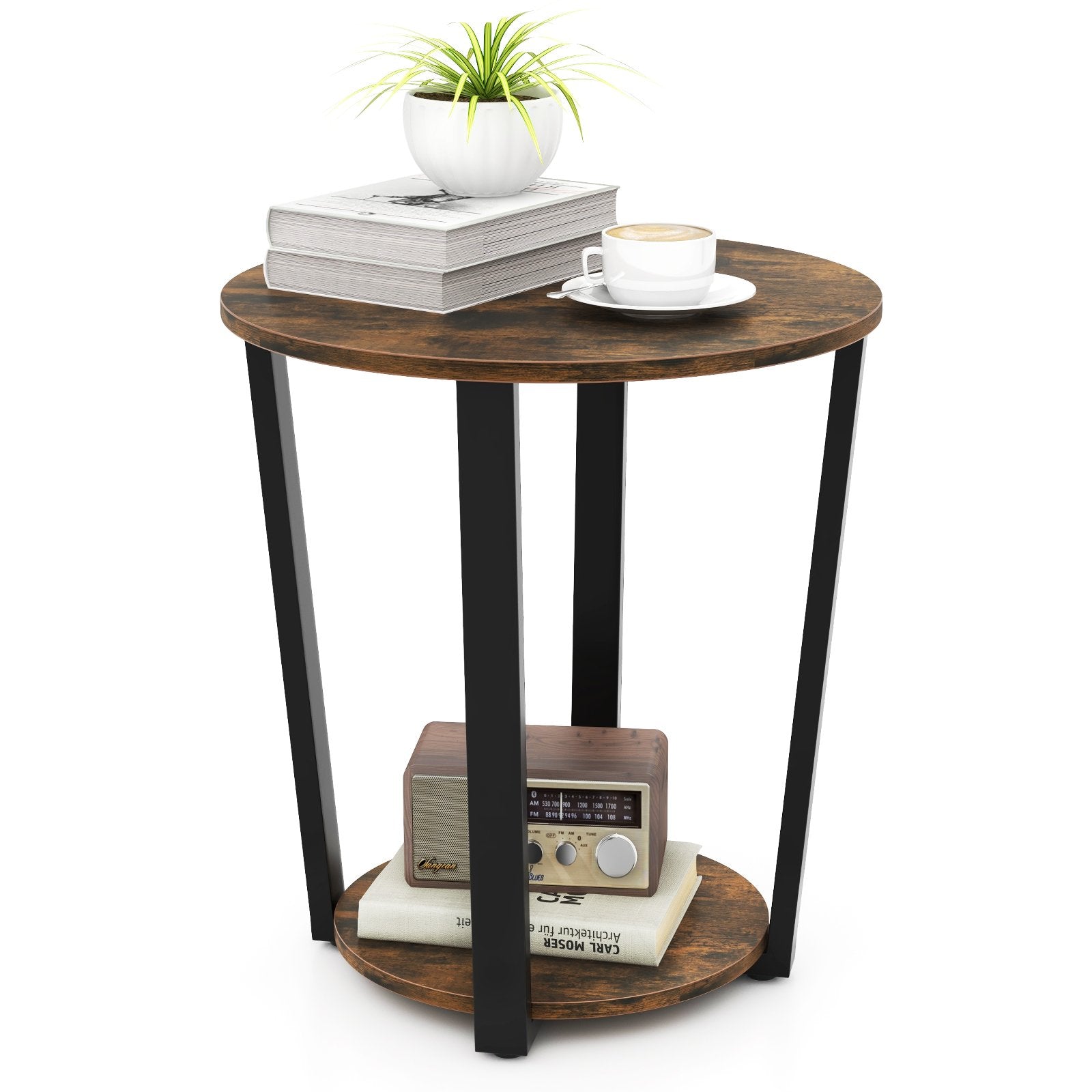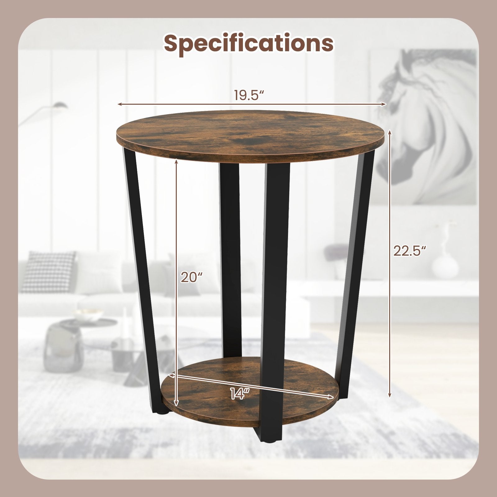 2-Tier Round End Table with Storage Shelf and Metal Frame-Brown