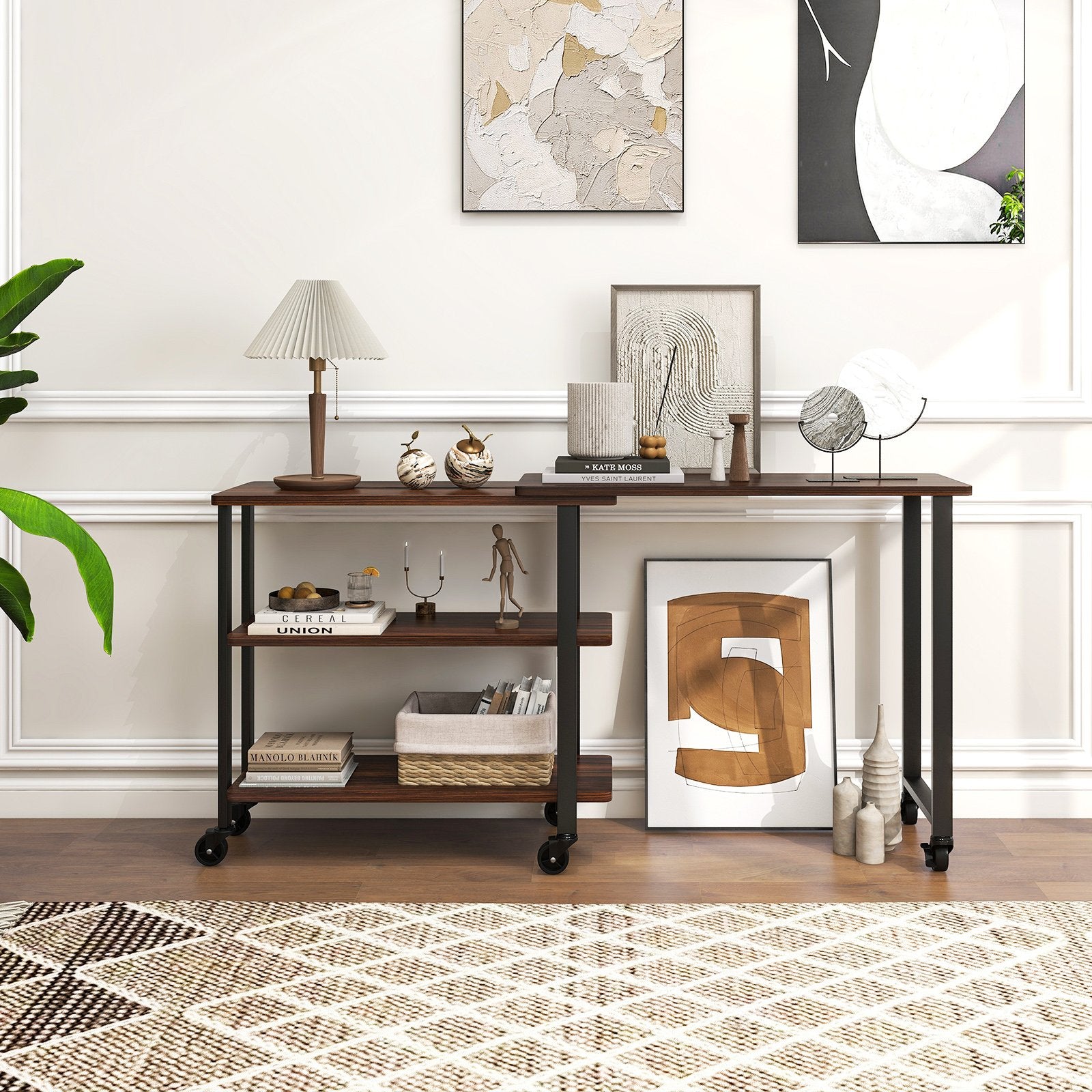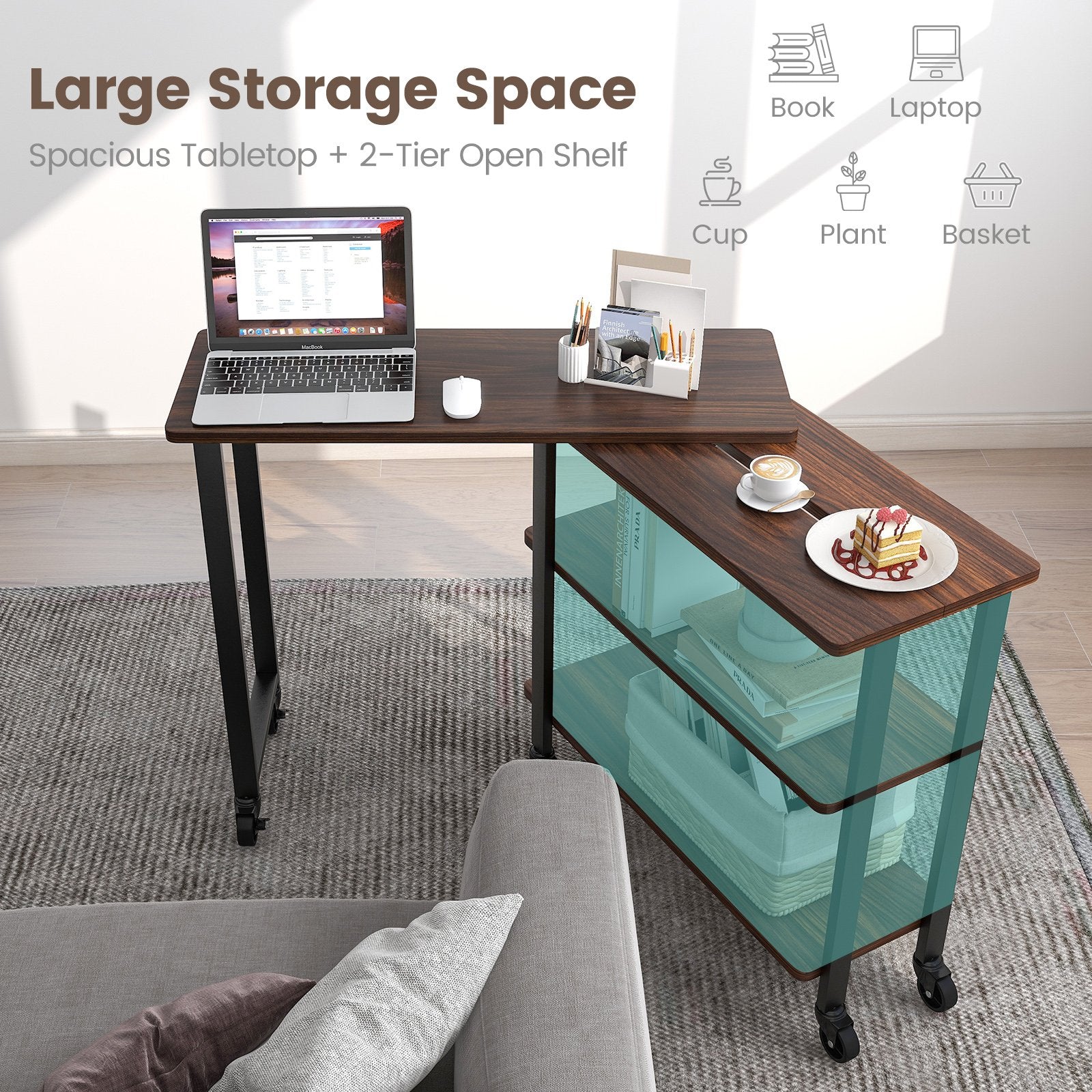 When extended to 180 degrees the corner desk offers spacious space for displaying books photo frames and other items you may have. When overlapping it can save space. Besides it also offers large storage space with a spacious tabletop surface and a 2-tier storage shelf. Thanks to the smooth-rolling casters 2 of which are designed with brakes flexible mobility and reliable safety can be easily achieved simultaneously. Sturdy structure with the thickened iron pipe is capable of keeping it durable enough for long-term rough use.