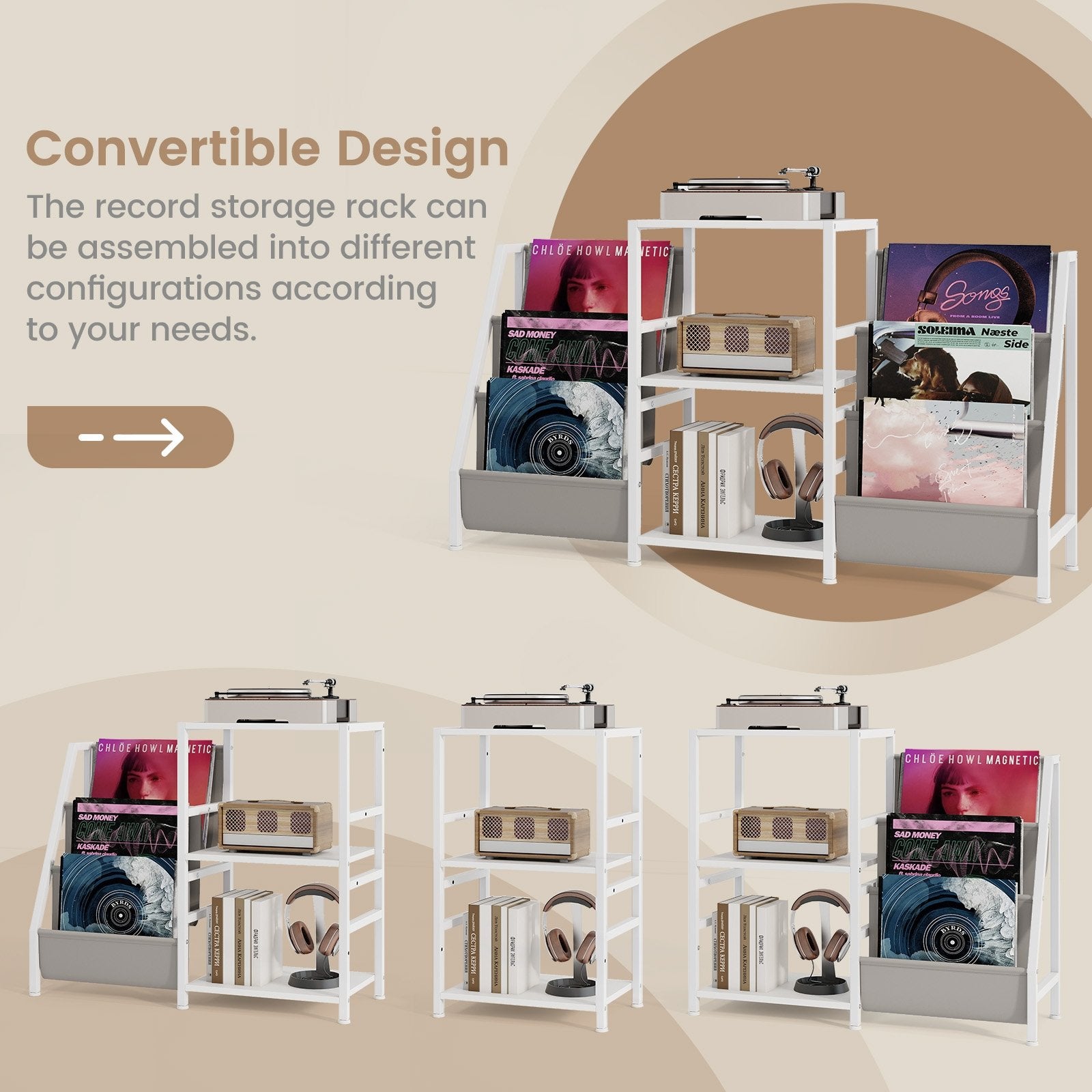 Convertible Record Player Stand: Choose between layouts: combine 3 side pockets on either the left or right side with the middle 3-tier shelf or opt for just the middle shelf. This convertible design allows you to tailor your storage to fit your space.