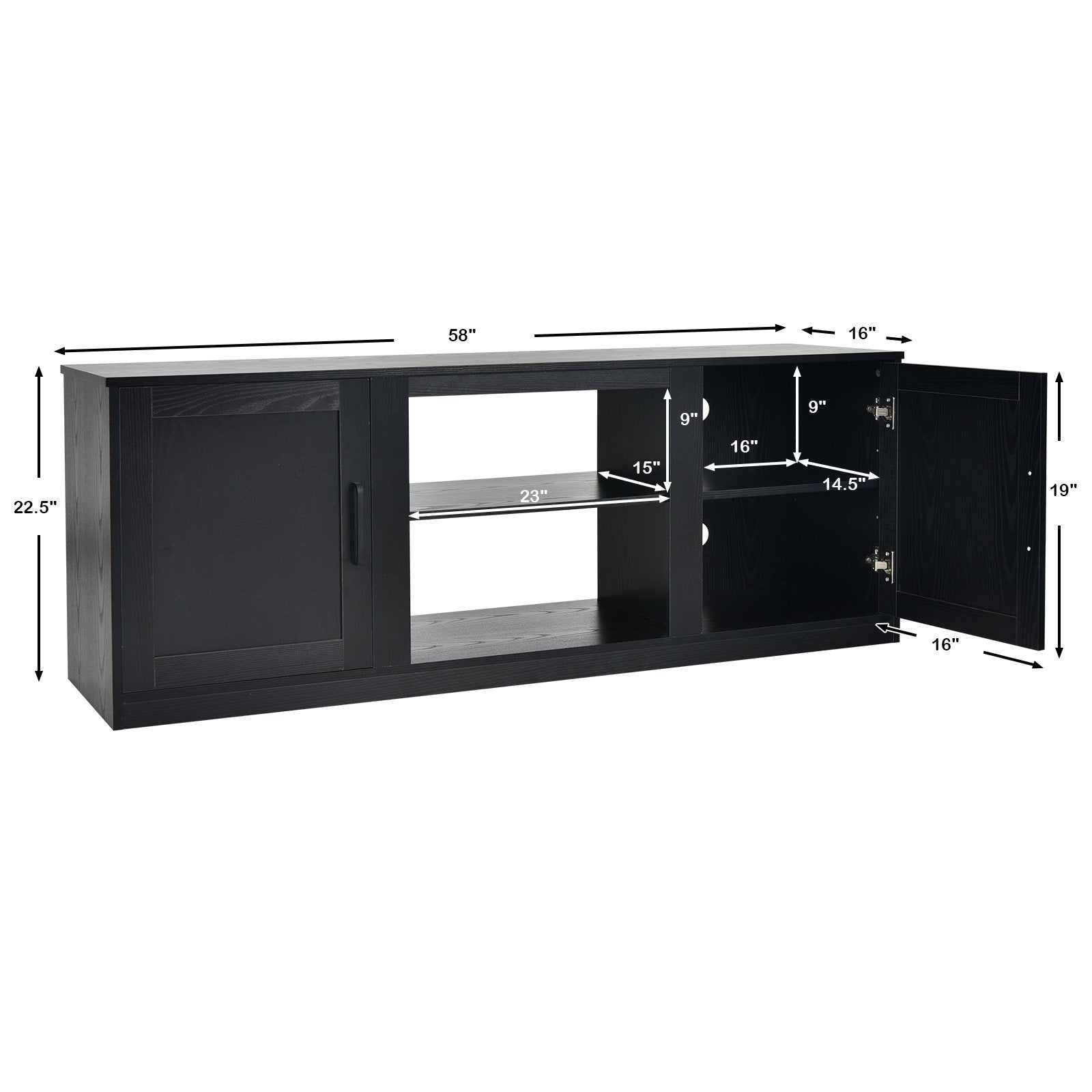 Rich Storage Capacity: Measuring 58" x 16" the desktop fits TVs up to 65" while adding extra room for frequently used items or decorations. The enclosed cabinet with 3-position adjustable shelves allows you to store items of different sizes. You can remove the open shelf(3 heights) in the middle cabinet for an 18" electric fireplace(electric fireplace not included).