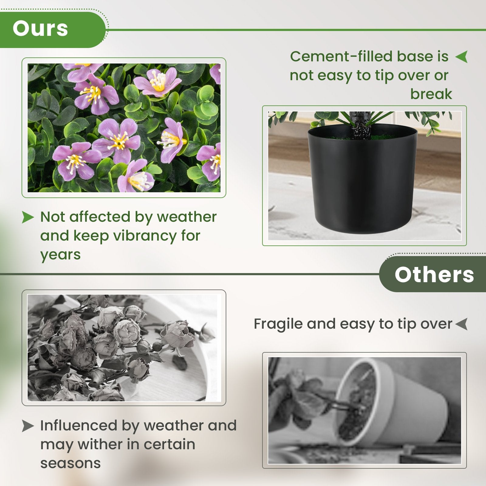 Sturdy Cement-poured Pot: The flower pot of our fake greenery is filled with cement providing stability and ensuring that the tree remains upright even in the face of minor impacts. For outdoor settings we recommend pairing the plant with weighted planters to prevent toppling.