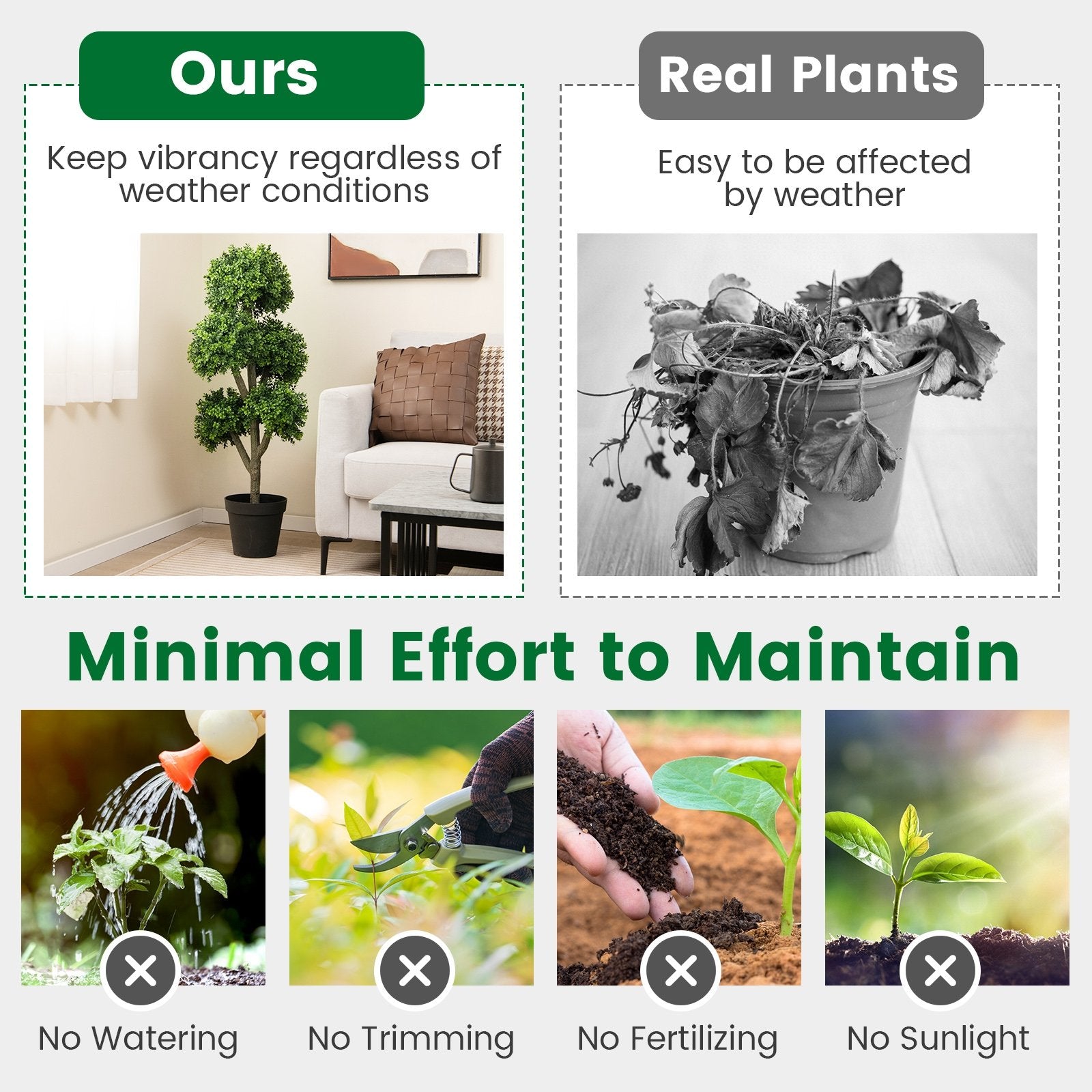 Without Trivial Plant Care: The artificial boxwood ball tree requires none of the time-consuming maintenance tasks such as trimming watering fertilizing or chasing sunlight which is energy-saving. And the faux ball plant always maintains its lush green color throughout the year.