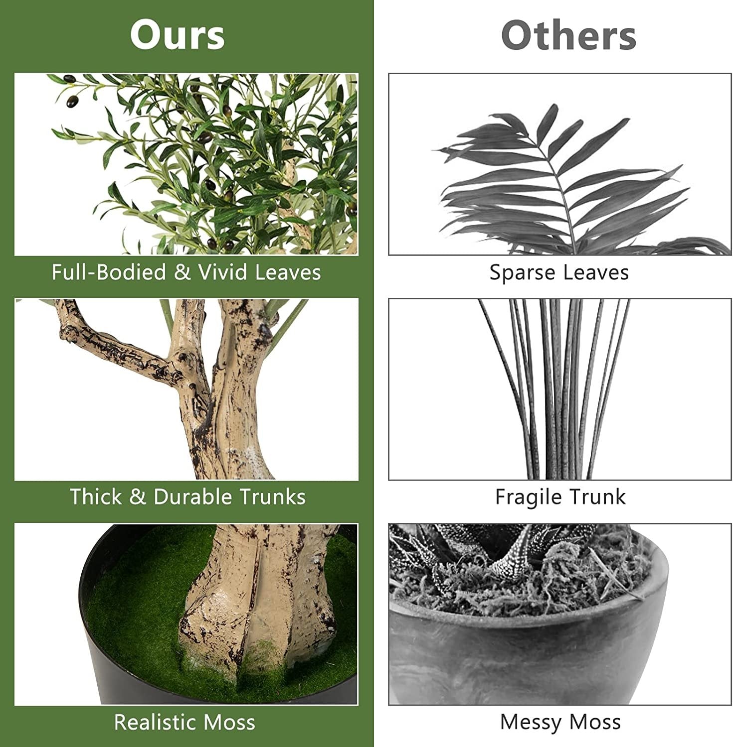 Vivid and Natural Appearance: The artificial olive tree is adorned with 1296 dense leaves 72 high-simulated olive fruits and natural-looking trunks which realistically mimic the appearance of real olive trees to light up your place. And with their natural colors and realistic textures the artificial plants look more vivid and fuller.