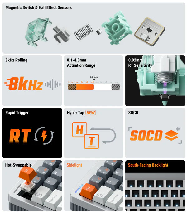 The Halo65HE Grey Magnetic Coral/Jade Pro is the ultimate mechanical keyboard for gamers and remote workers alike. Crafted with precision, it features a fully modular design, allowing for customization with ease. Whether you're gaming for hours or tackling your work tasks, the Halo65HE delivers top-tier performance with its responsive keys, magnetic connectivity, and modern aesthetic. The ergonomic layout ensures comfort even during extended sessions, while the magnetic switches allow for fast and hassle-free adjustments. Upgrade your setup with this perfect balance of style, performance, and functionality.