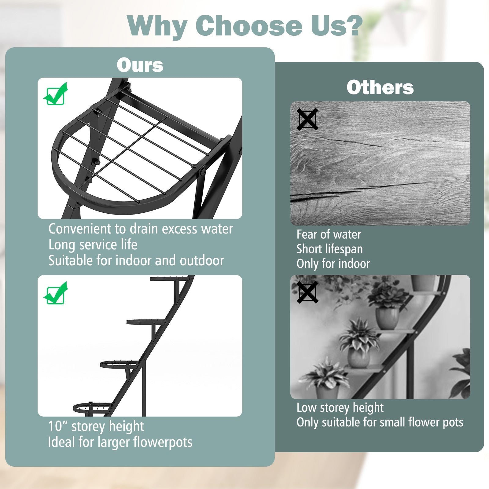 Upgraded Metal Structure: Made entirely of metal with a sprayed surface the plant stand is ultra stable and built to last. And the 5-tier shelves feature a grid layout to avoid accumulating water thus prolong lifespan. To ensure stability on uneven surfaces the plant stand comes with 8 adjustable foot pads.