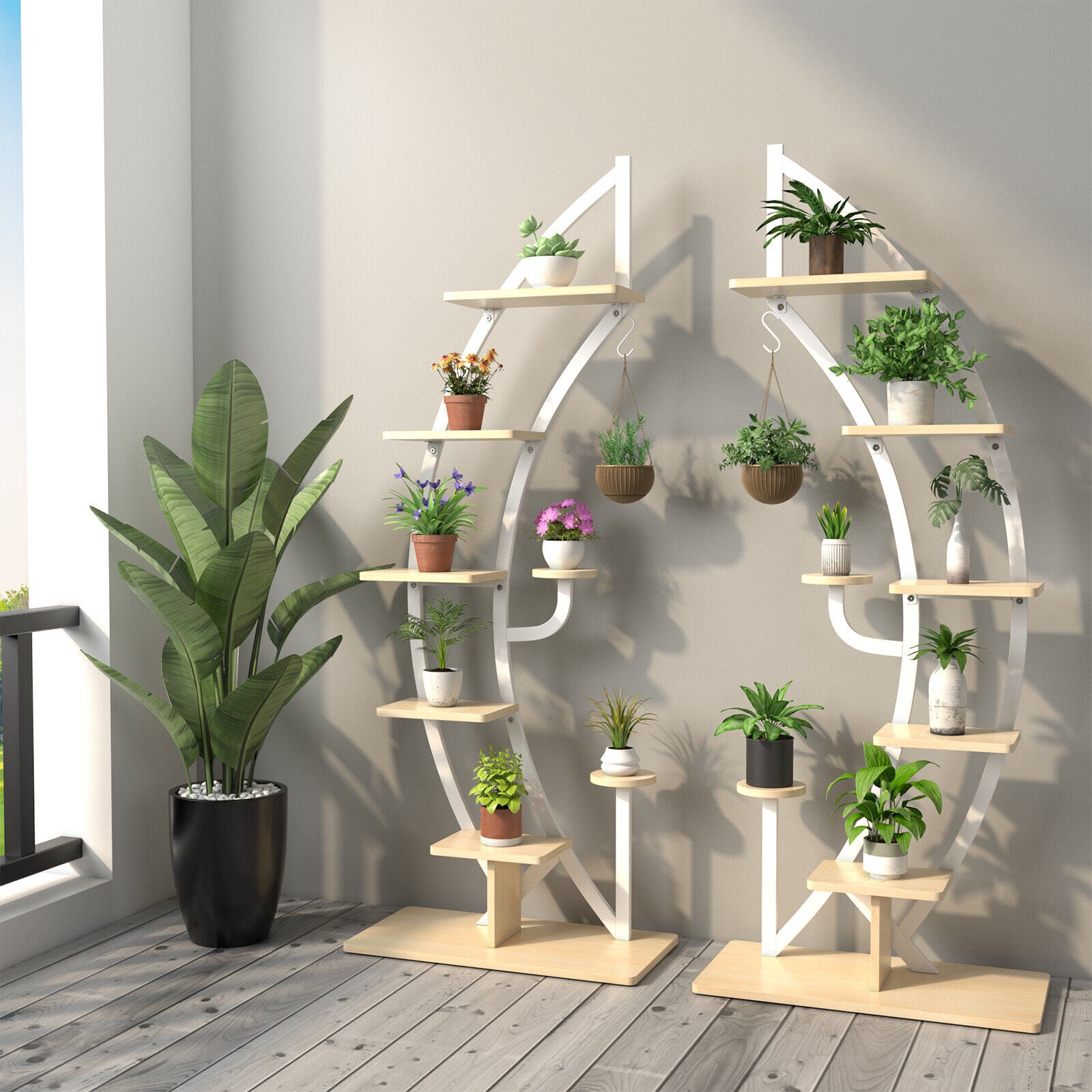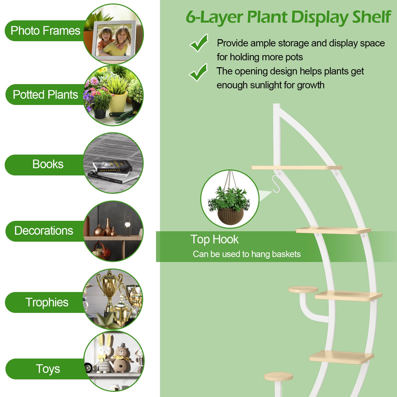 Multi-Layer Storage Space: The 6-tier moon half plant stand adopts a 6-layer ladder structure which not only provides ample storage and display space for holding 7 pots but also allows for maximum sunlight for each plant. Besides there exists an extra top hook for hanging baskets. And each shelf can load up to 50 lbs. The Top hanger can hold up to 11 lbs.