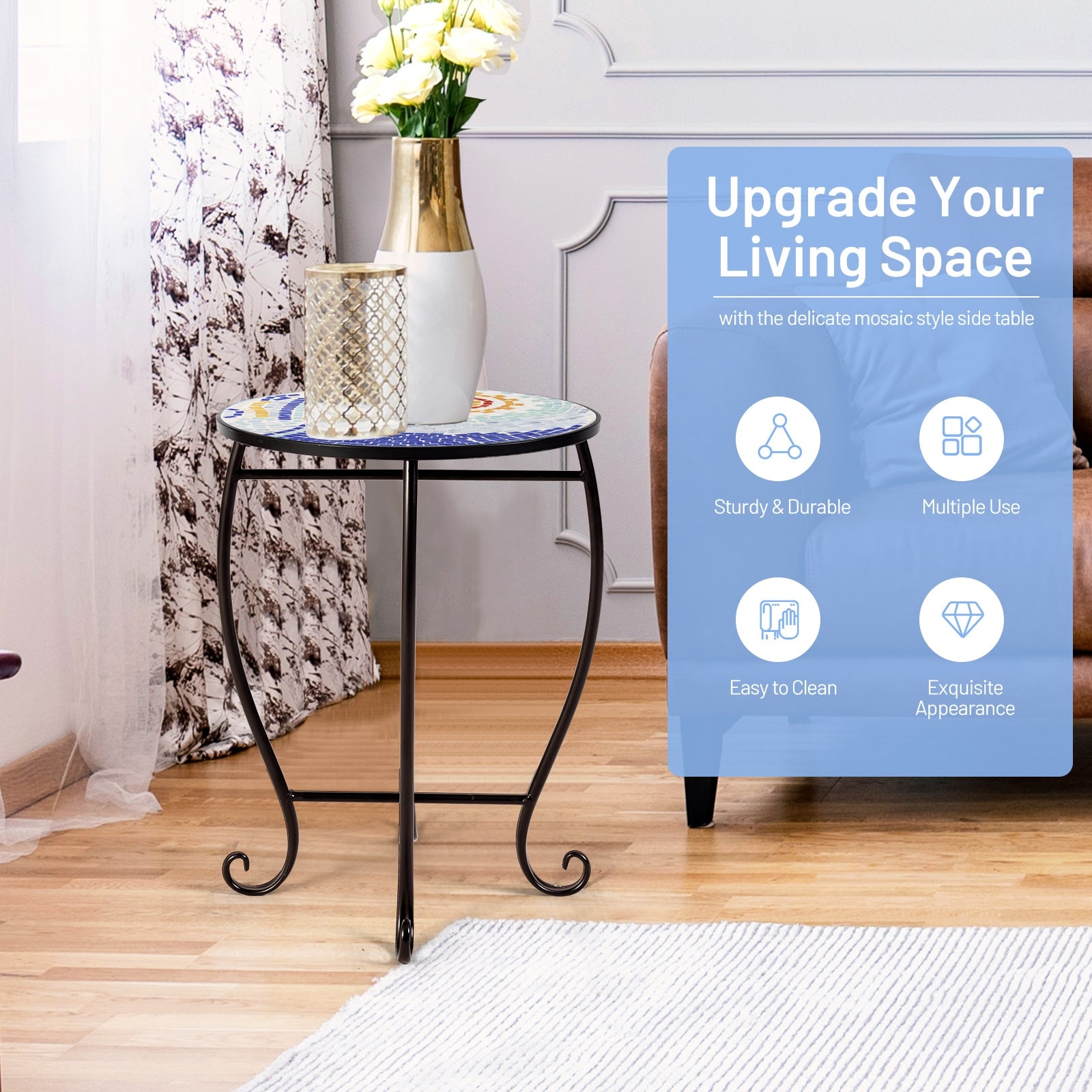 It features an inlaid glass mosaic top with a deep colorful scheme. The frame and curvaceous legs are constructed of black finish steel that will withstand the elements. It can be as a porch or patio piece plant stand indoor accent or bistro table. It is a perfect spot for drinks books or plants. A masterpiece to add charms to your living room bedroom kitchen patio and garden.