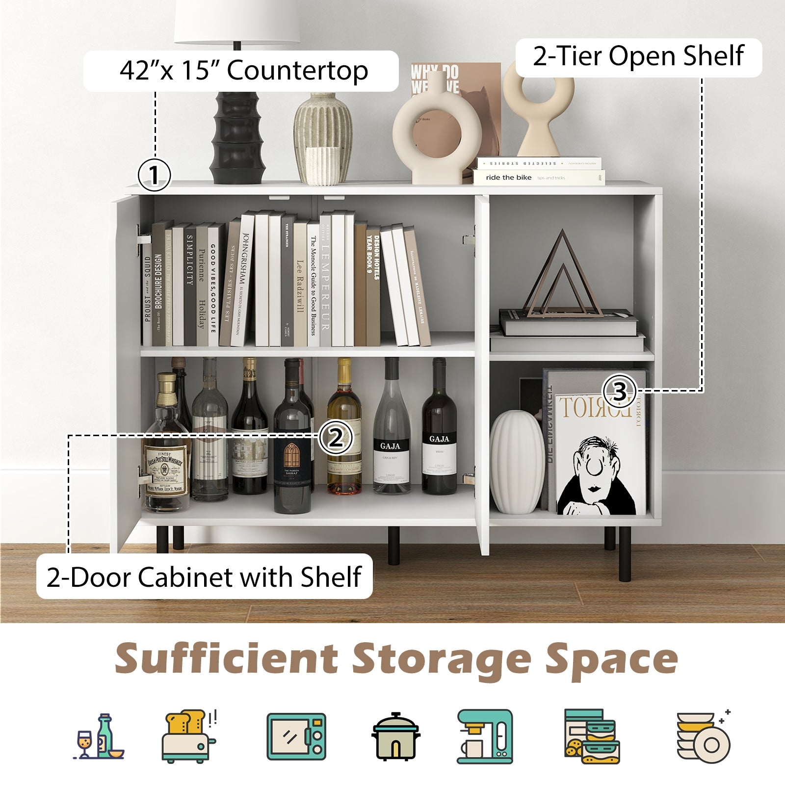 Sufficient Storage Space: This functional buffet sideboard features a 42” x 15” countertop 2-door cabinet with shelf and 2-tier open shelf. With ample storage space the storage cabinet is perfect for organizing dinnerware meals and so on.