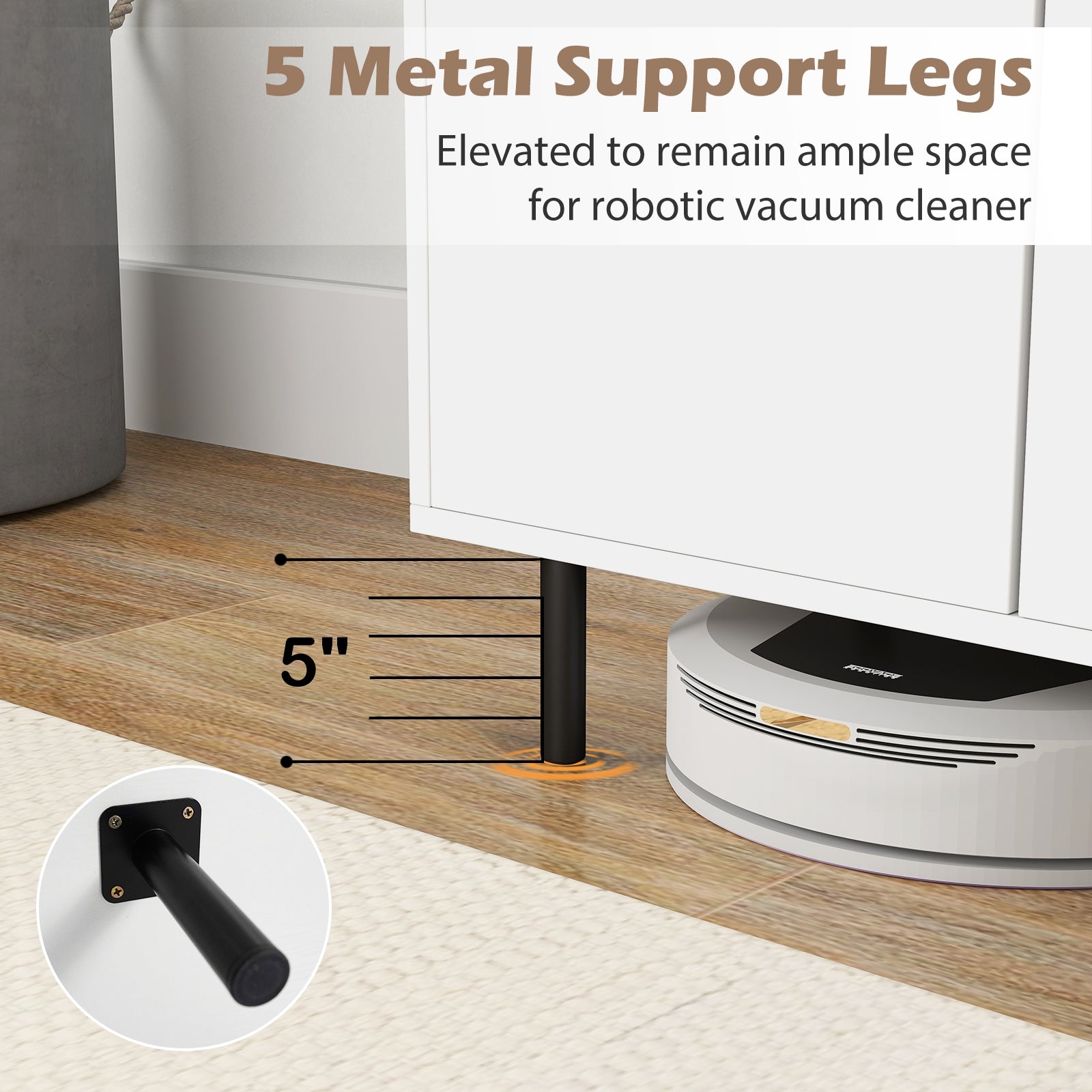5 Metal Support Legs: Supported by 5 sturdy metal legs this cabinet provides enhanced stability and weight distribution enabling the countertop to hold 200 lbs. Moreover the bottom is 5” elevated to remain ample space for robotic vacuum cleaner.